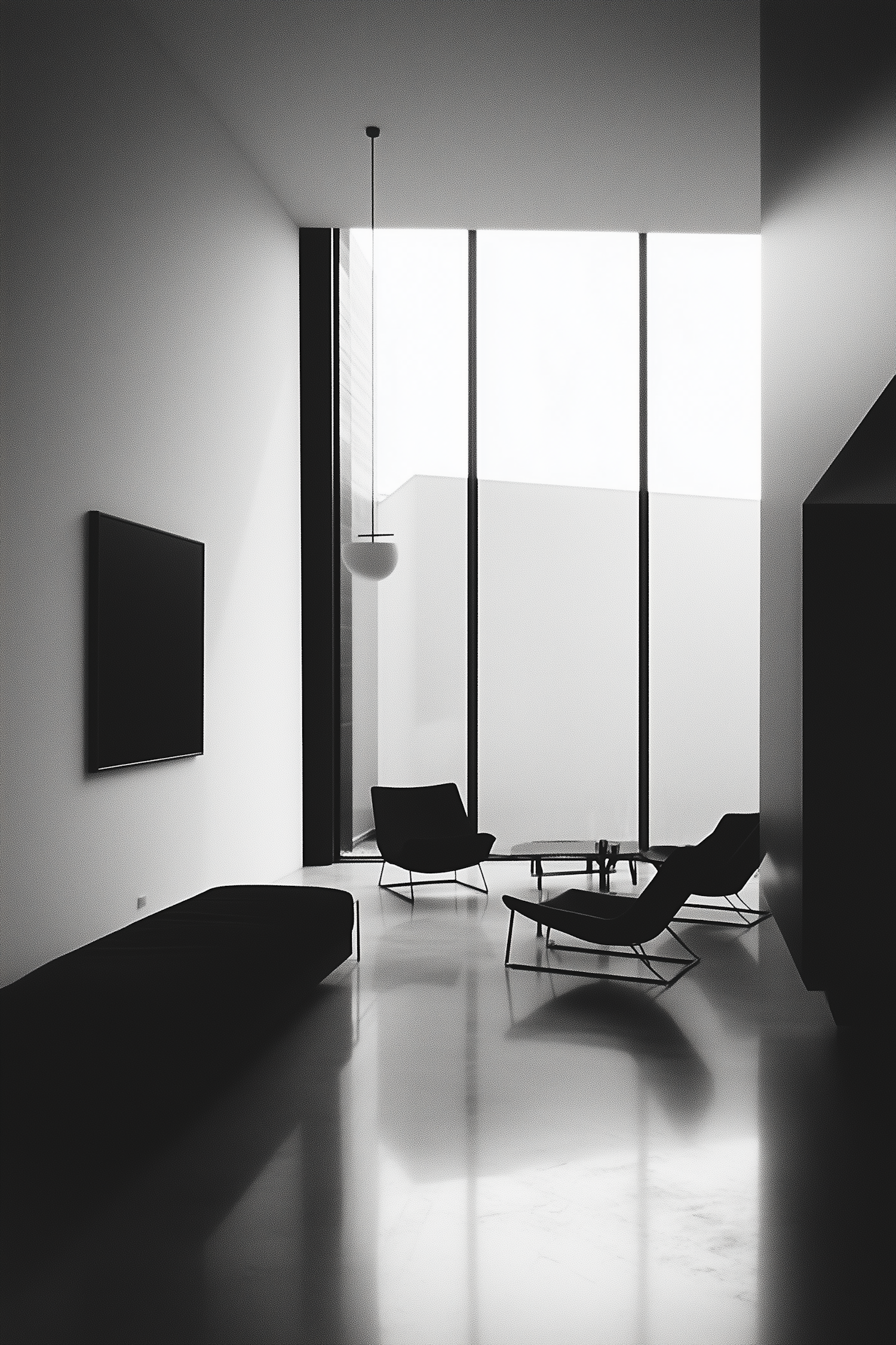 Minimalist living room with black furniture, large windows, and sleek design. Monochrome elegance and natural light create a serene atmosphere.