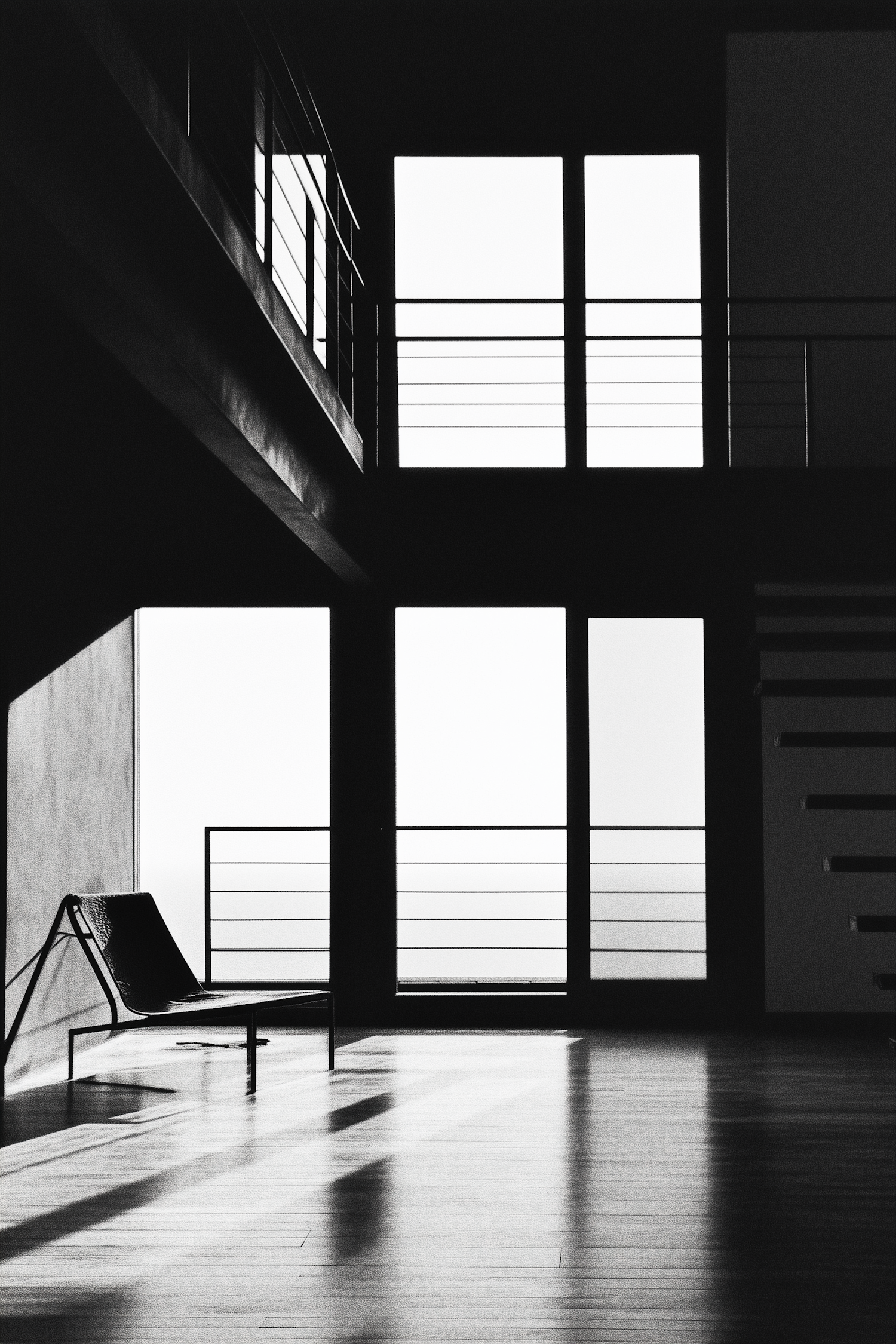 Minimalist interior with large windows, sleek black chair, and polished wooden floors, emphasizing clean lines and natural light.