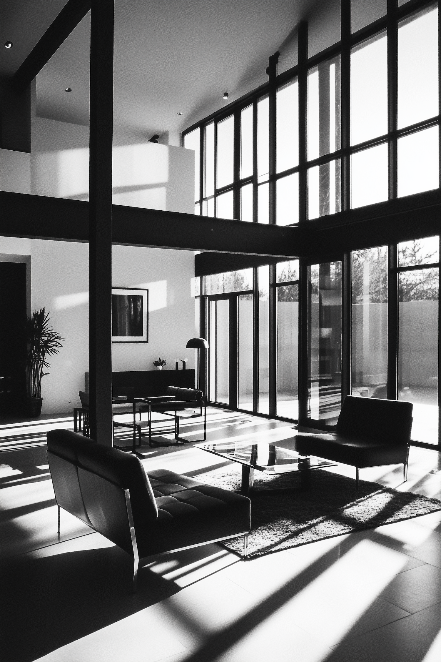 Modern minimalist living room with large windows, sleek black furniture, and natural light creating geometric shadows.