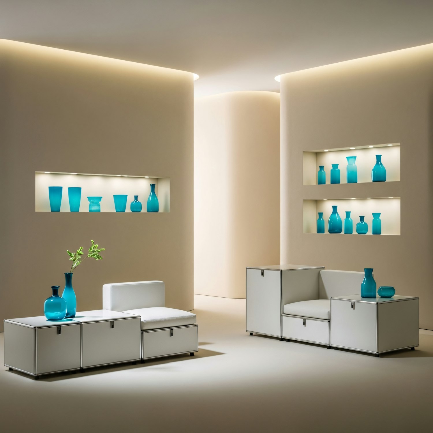 Modern beige interior with modular white furniture and vibrant blue glass vases on built-in shelves, creating a minimalist aesthetic.