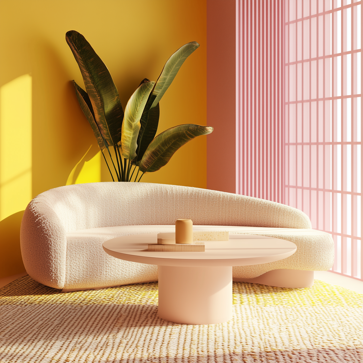 Modern living room with a curved sofa, yellow wall, and pink blinds. Features a round coffee table and a large green plant.