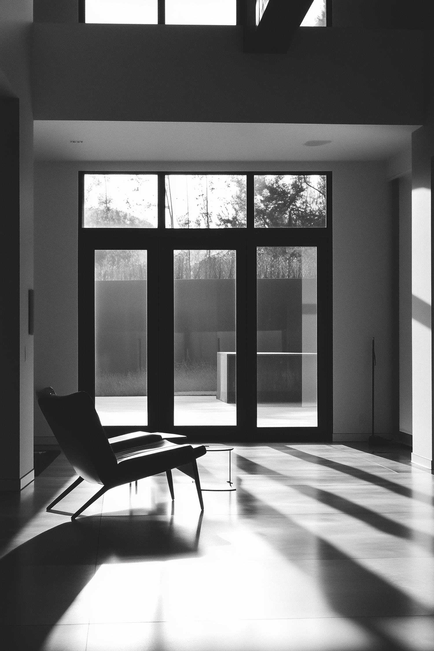 Minimalist interior with a sleek black armchair and large windows casting dramatic shadows on the floor.