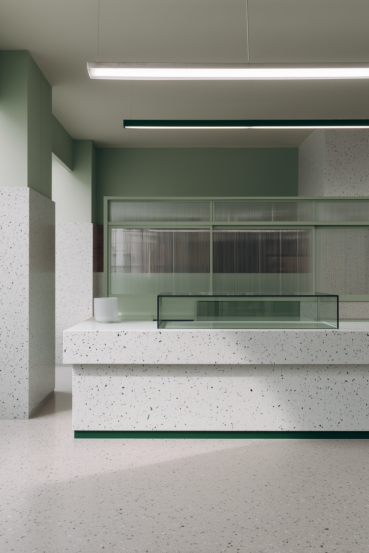 Minimalist interior with terrazzo surfaces, soft green walls, and a sleek glass display case under modern linear lighting.