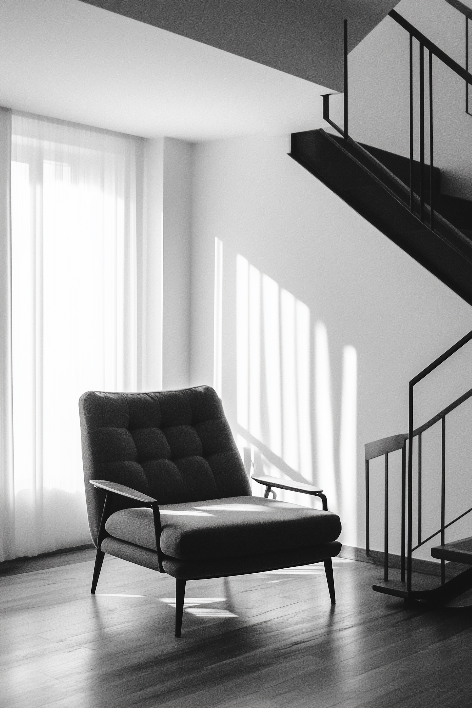 Minimalist interior with a black tufted armchair, wooden floor, natural light, and a sleek metal staircase for a modern aesthetic.
