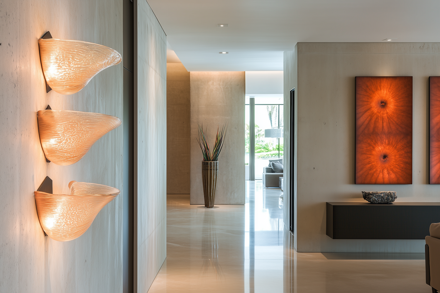 Modern hallway with amber wall sconces, abstract orange art, and a tall vase, leading to a bright living area with large windows.
