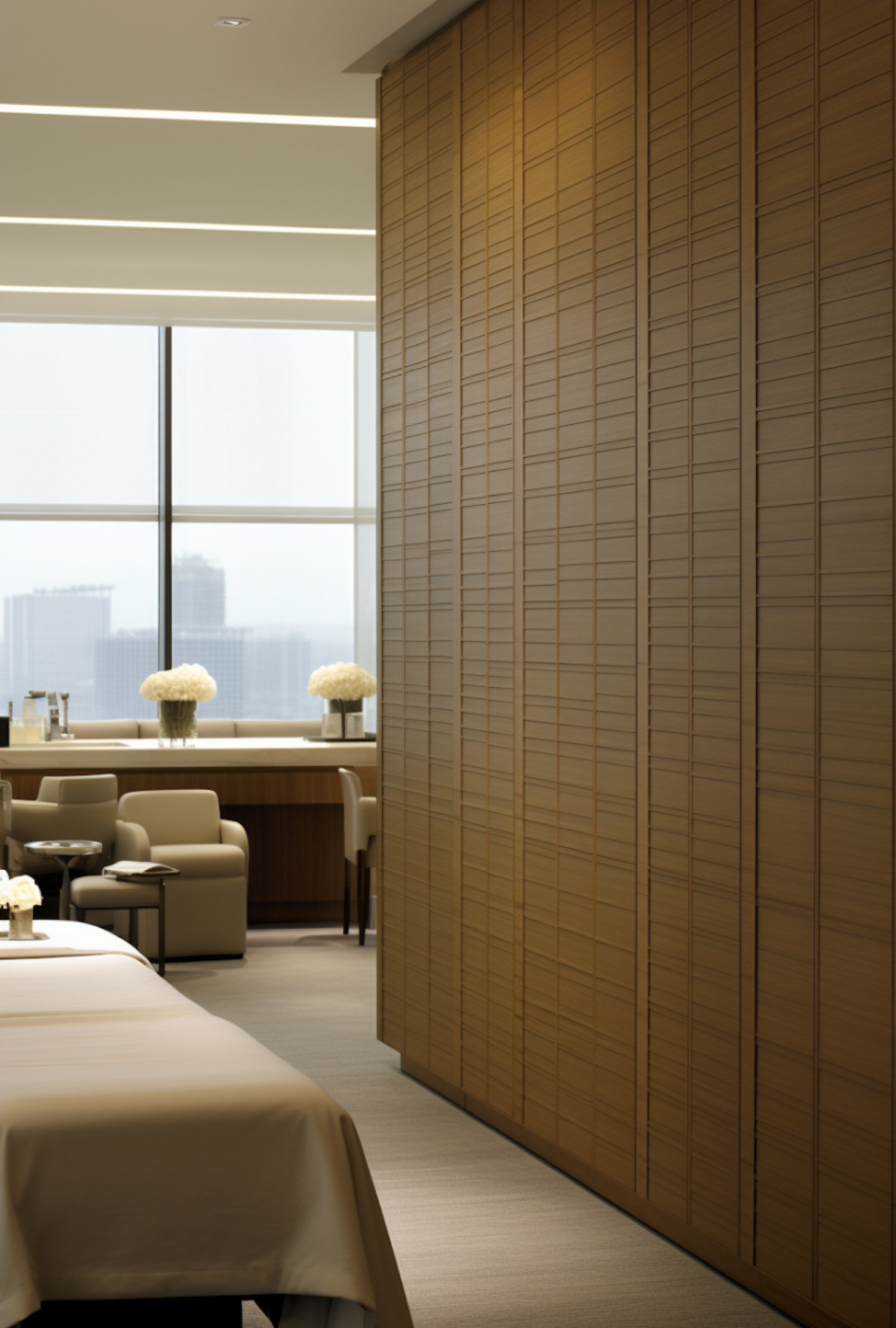 Luxurious spa room with a beige bed, wooden wall, and city view. Elegant decor with white flowers and natural light.