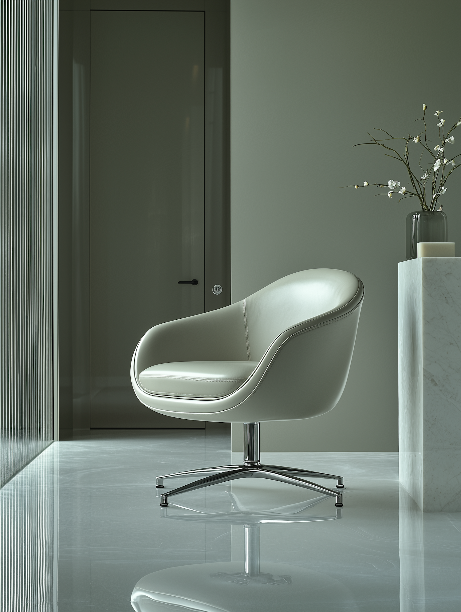 Modern interior with a sleek gray swivel chair, marble pedestal, and delicate flowers. Minimalist design with muted colors and reflective surfaces.