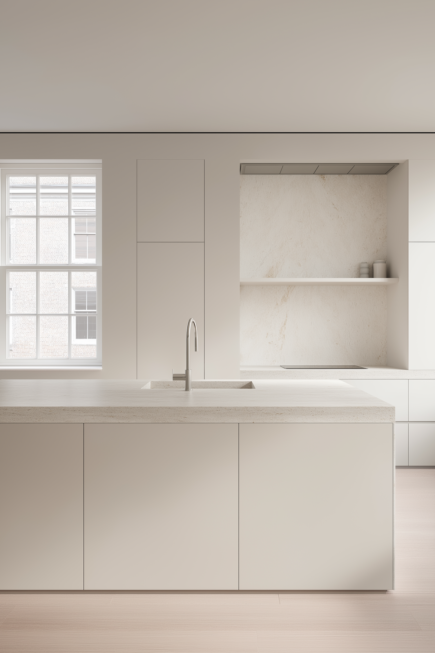 Minimalist kitchen with a sleek island, light stone countertop, and natural light from a large window. Clean, modern, and functional design.