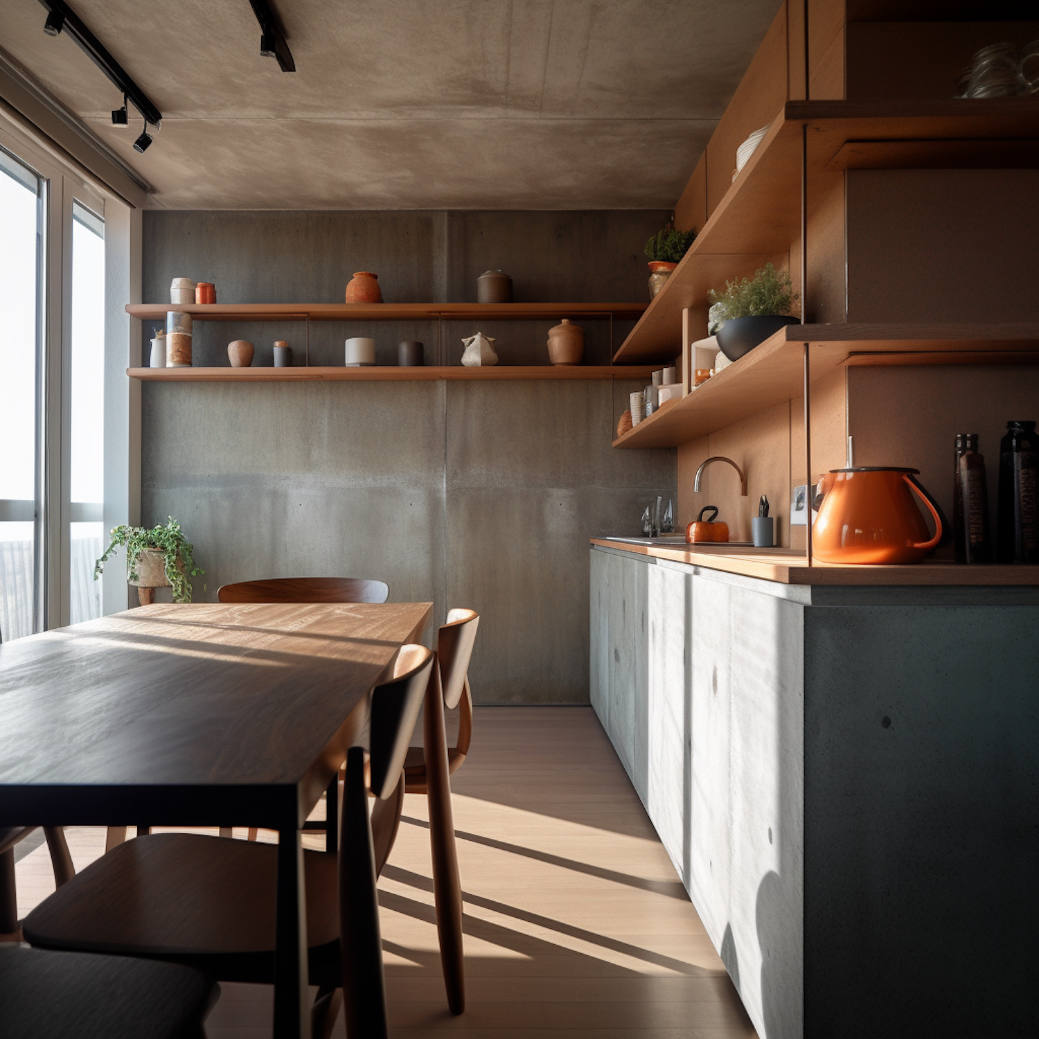 Modern kitchen with wooden table, concrete countertops, and open shelves. Natural light and earthy tones create a warm, inviting space.