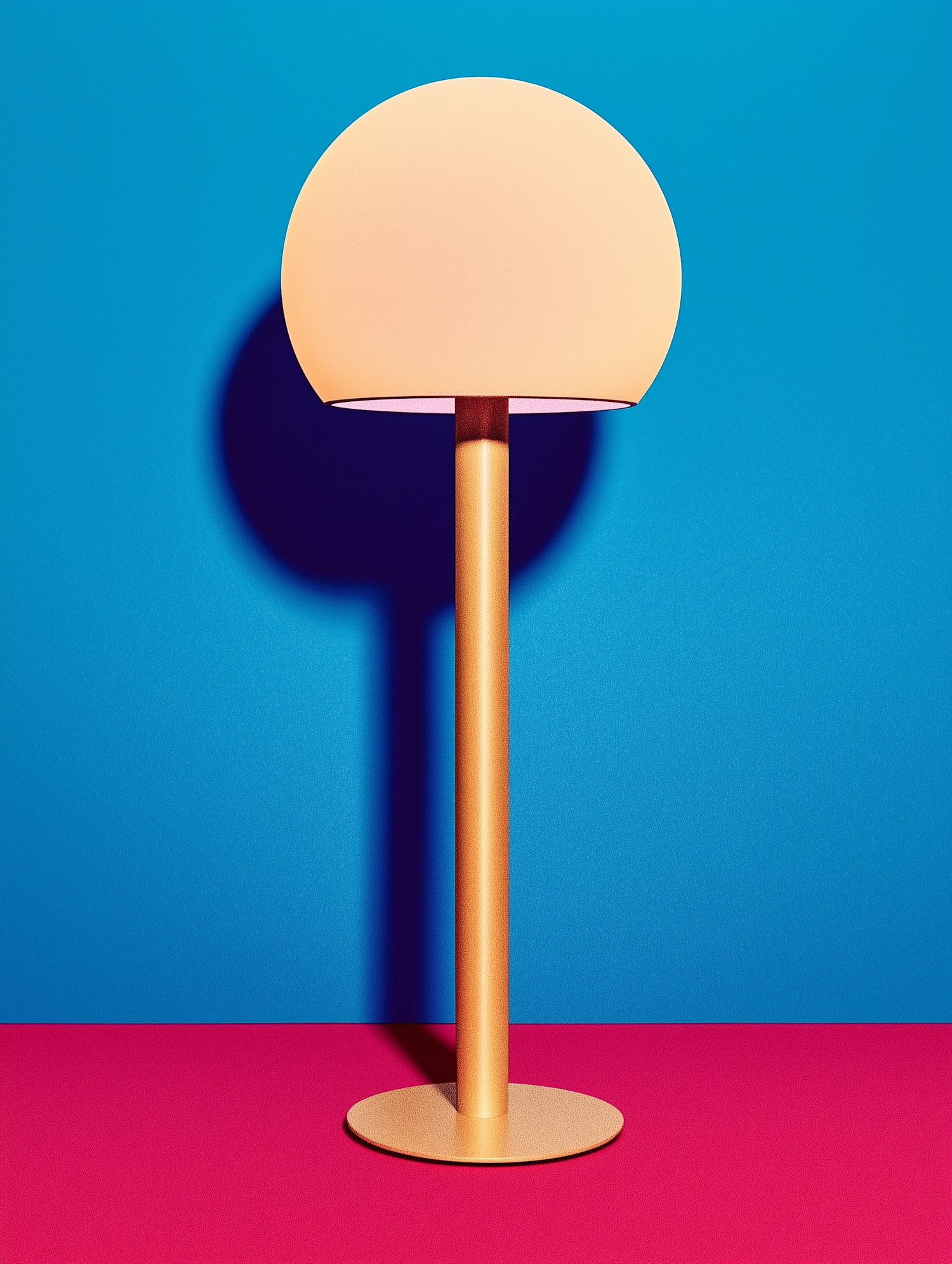 Modern yellow lamp with spherical shade against vibrant blue and pink background, showcasing minimalist design and bold colors.