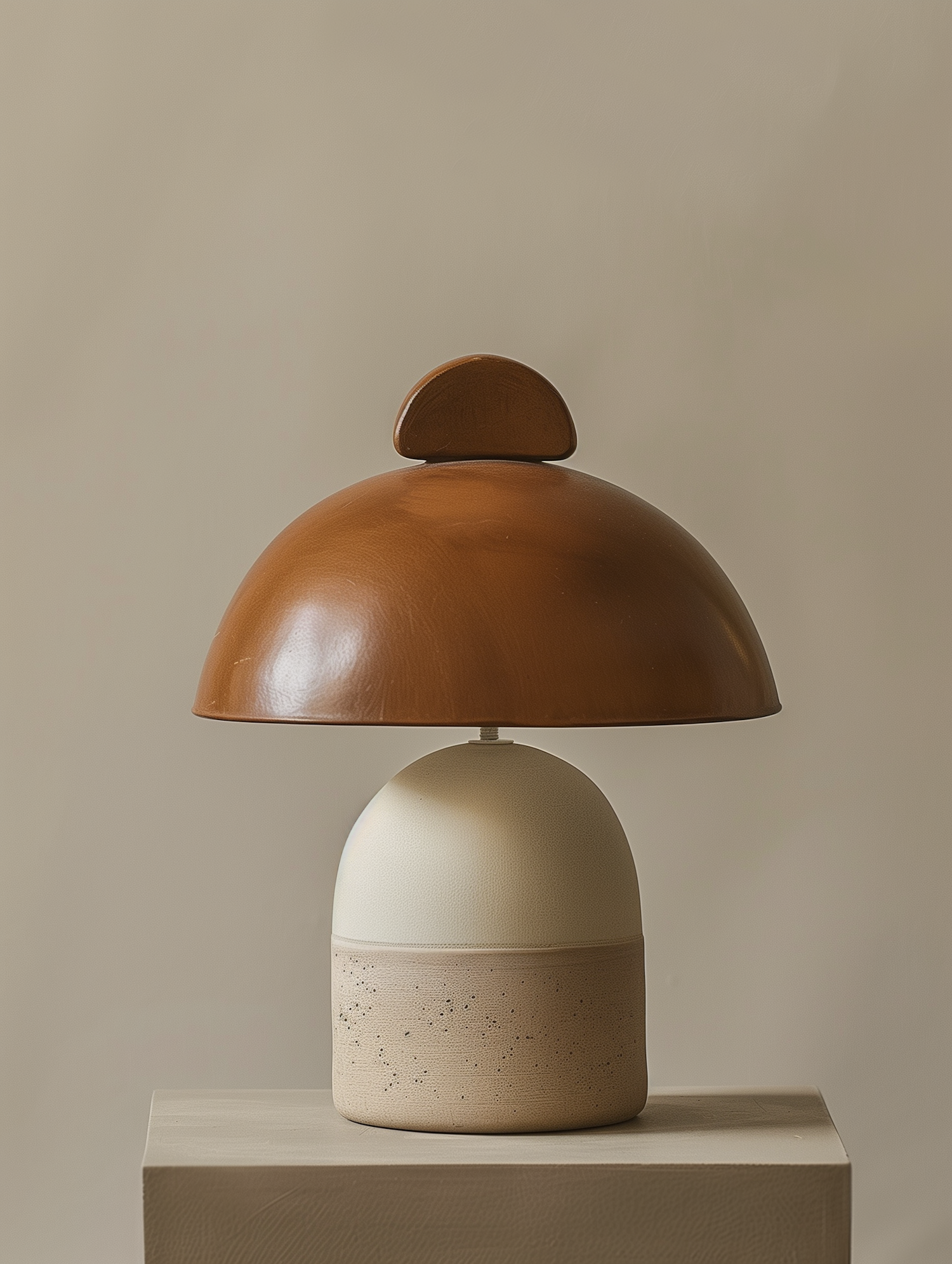 Modern table lamp with a brown dome shade and textured beige base, perfect for minimalist interiors. Neutral tones for a cozy vibe.
