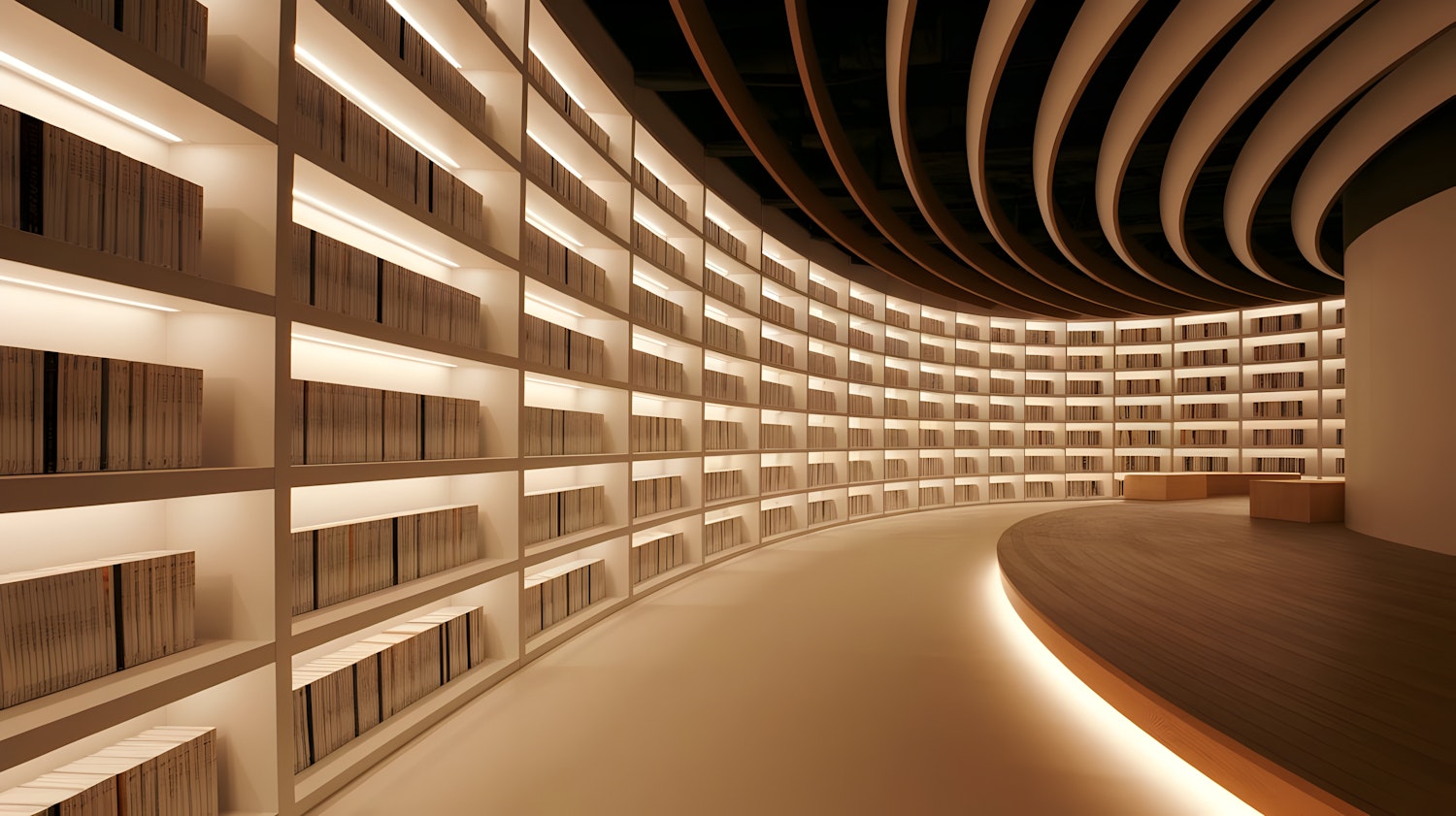 A sleek, curved library with warm lighting, minimalist shelves, and a modern wooden stage area. Perfect for book lovers and design enthusiasts.