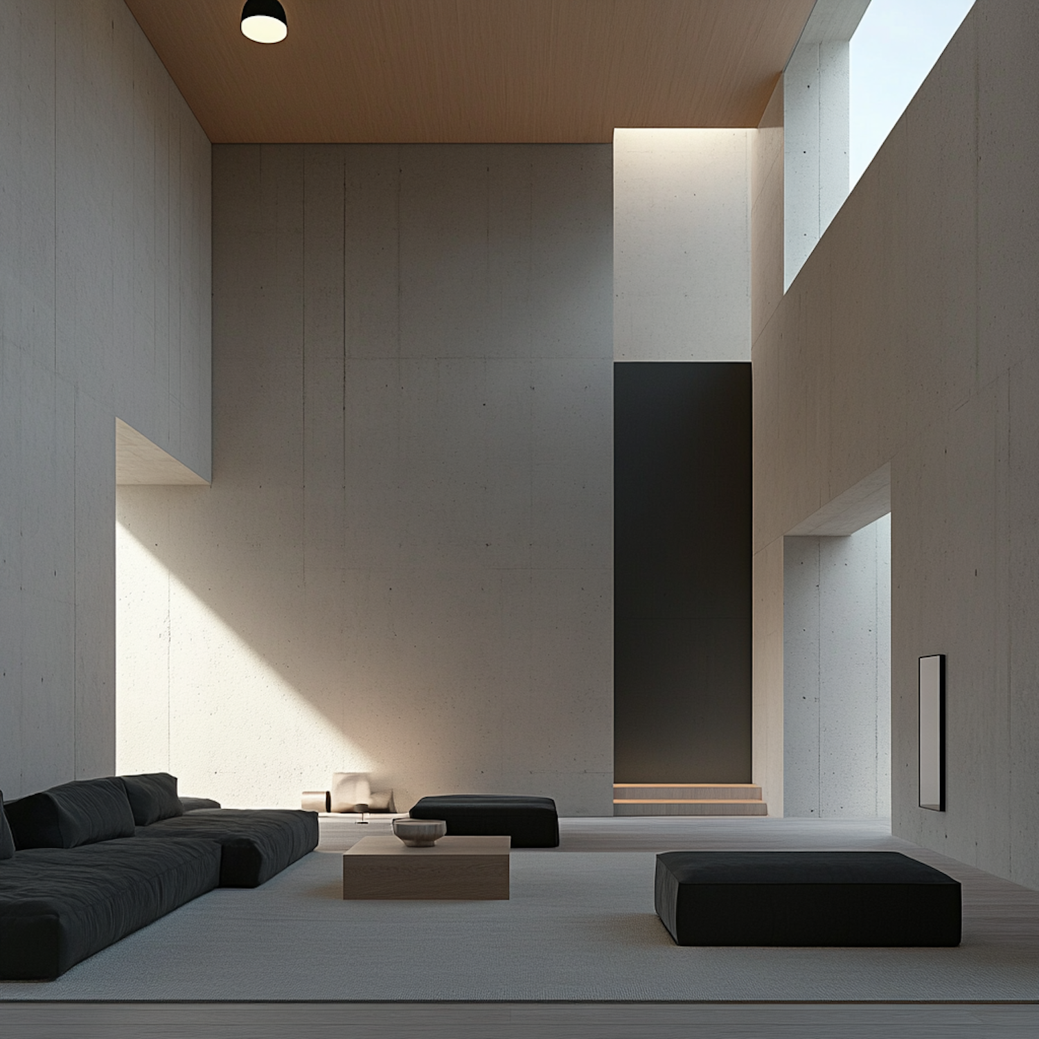 Minimalist living room with concrete walls, black furniture, and natural light from large windows. Perfect for modern design lovers.