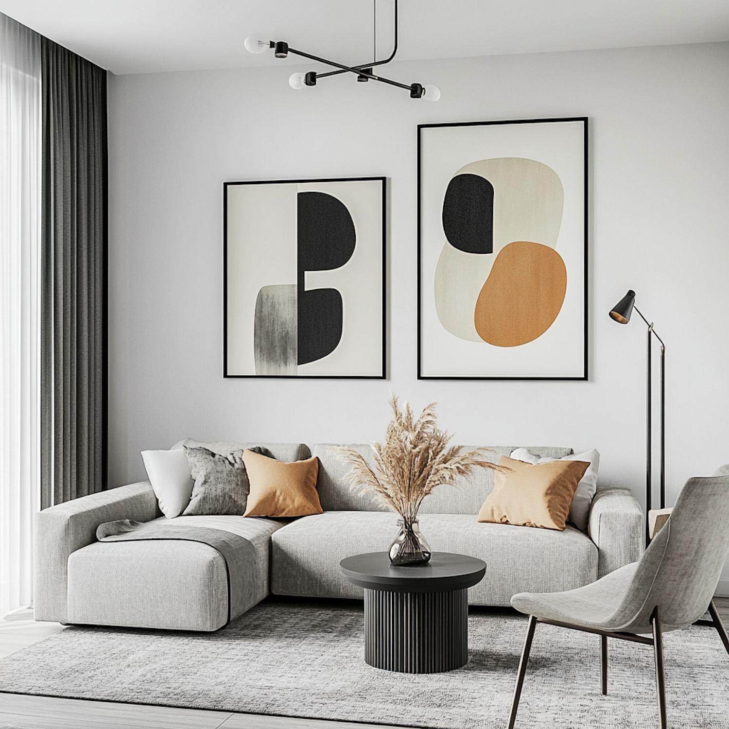 Modern living room with gray sofa, abstract art, and black accents. Features a round coffee table with pampas grass and a sleek floor lamp.