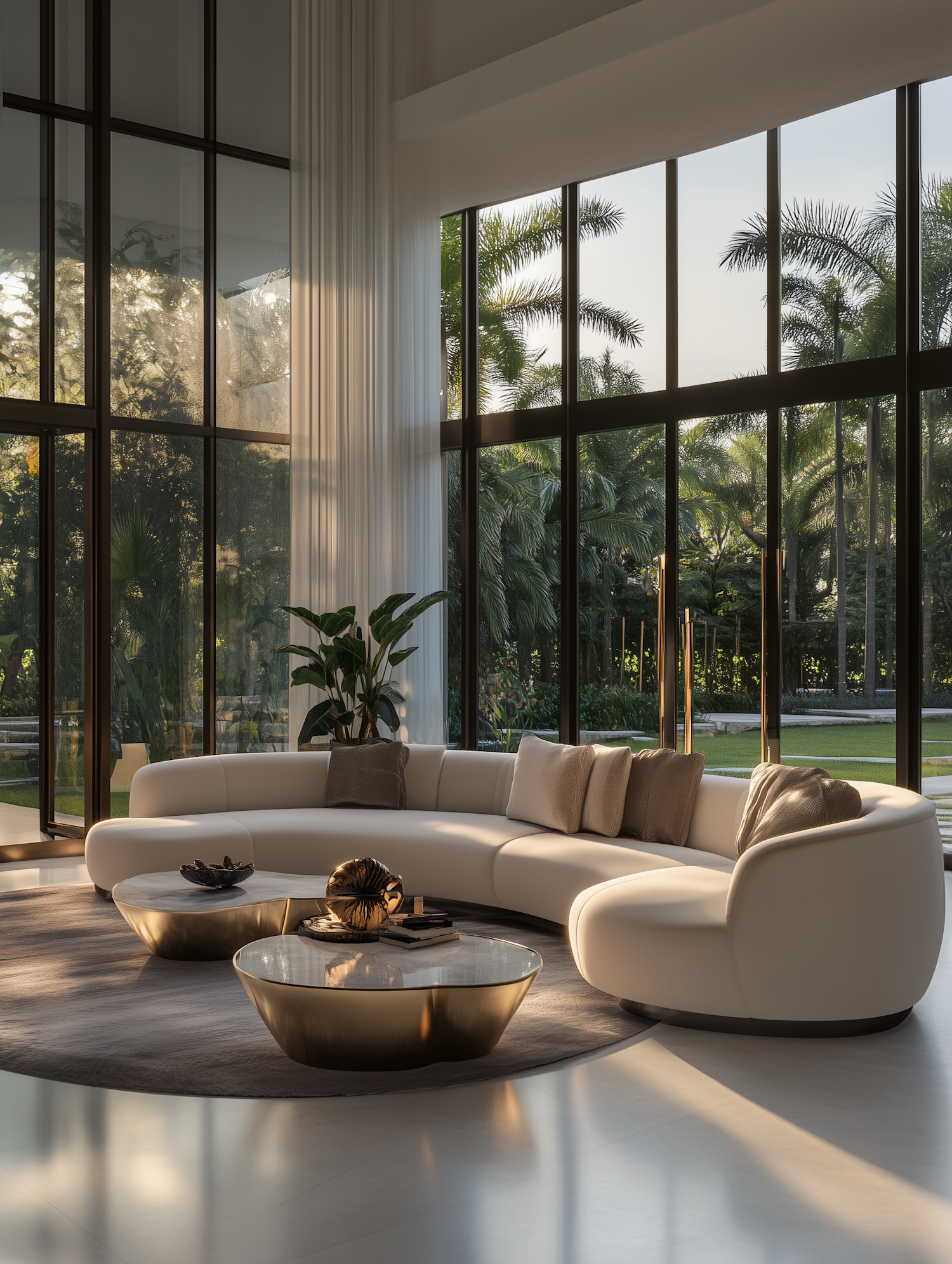 Modern living room with a curved white sofa, gold coffee tables, and floor-to-ceiling windows overlooking lush greenery.