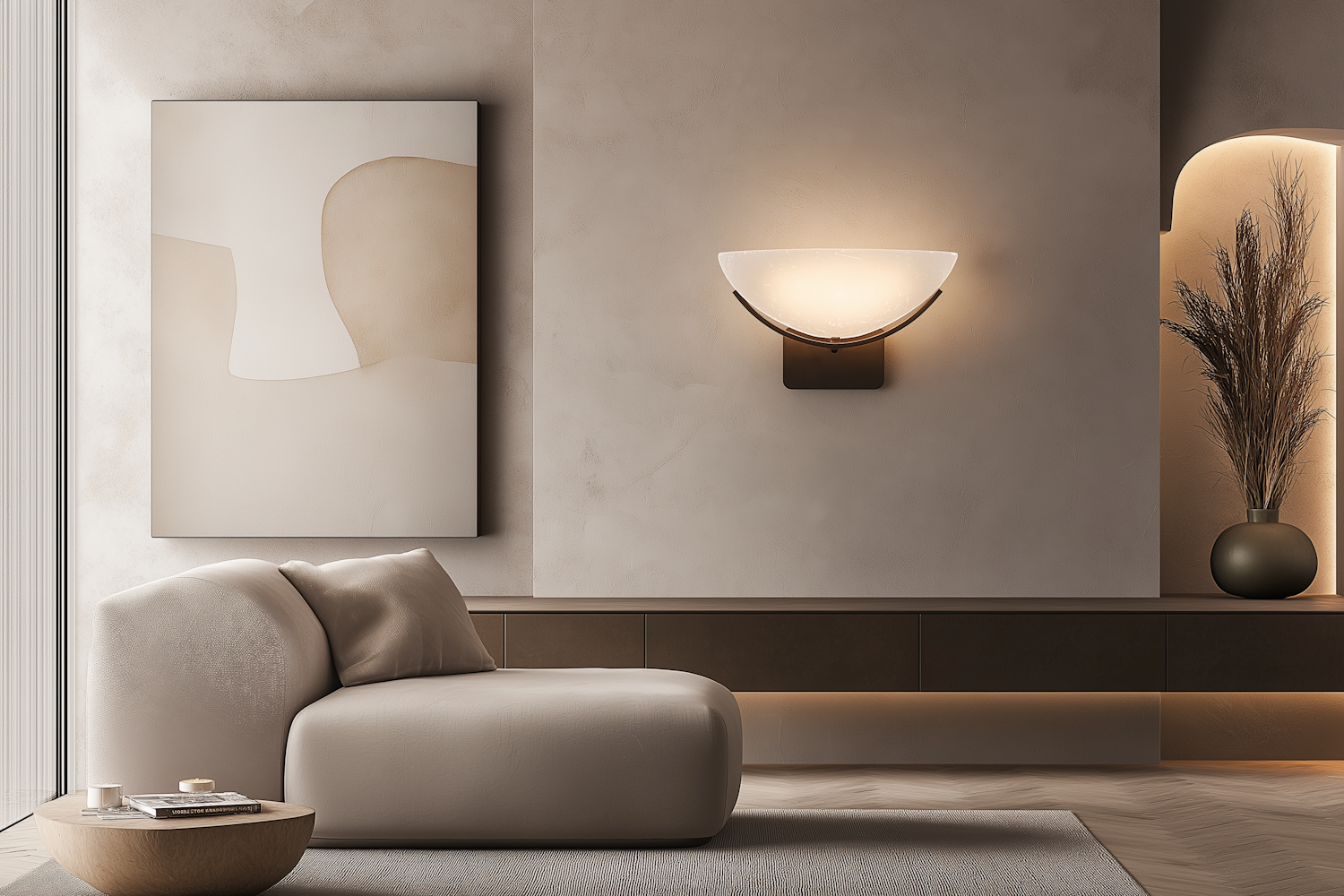 Elegant modern living room with cream sofa, abstract art, and warm lighting. Neutral tones create a serene and sophisticated ambiance.