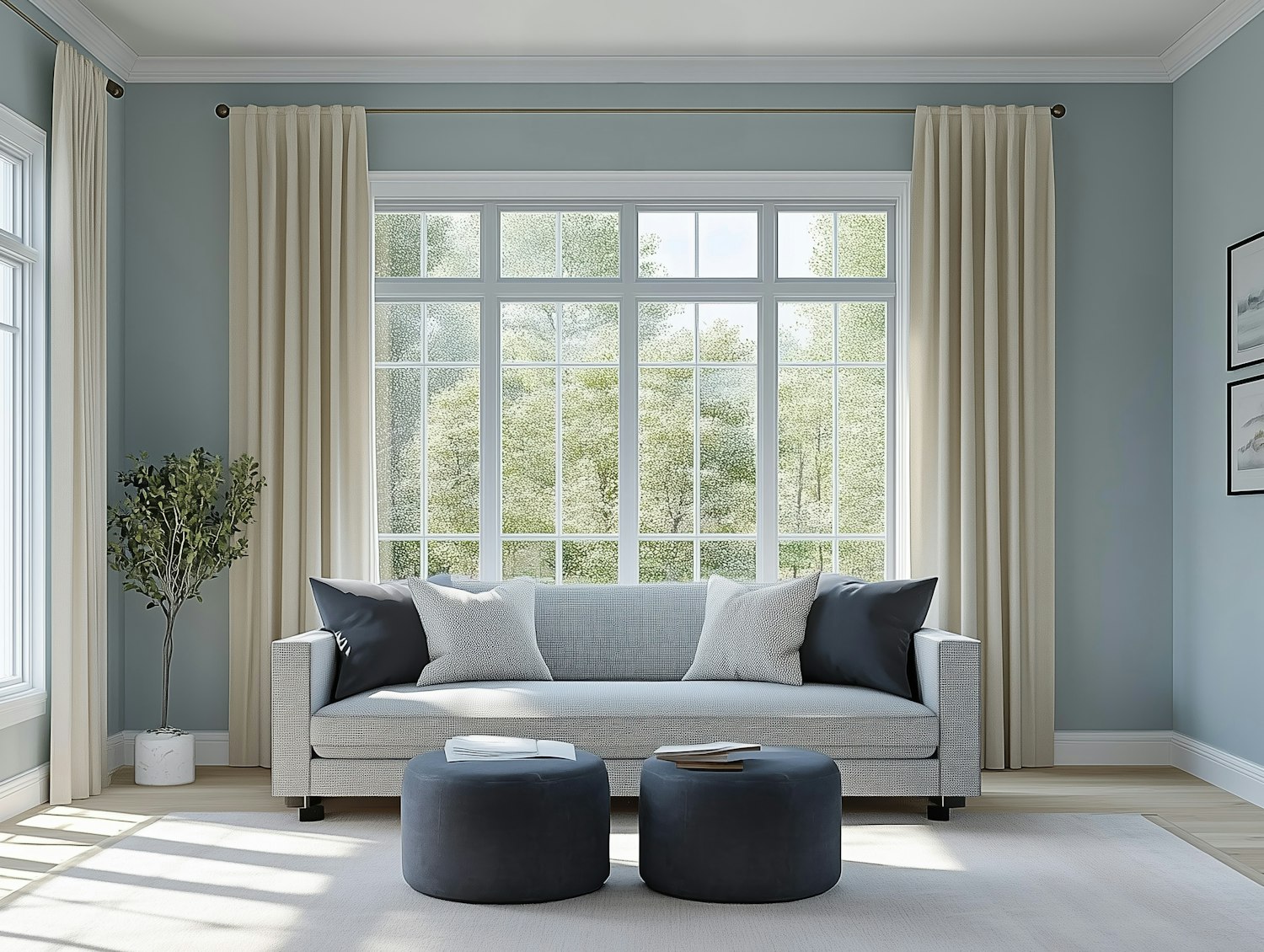 Modern living room with light blue walls, beige curtains, gray sofa, dark blue ottomans, and natural light from a large window.