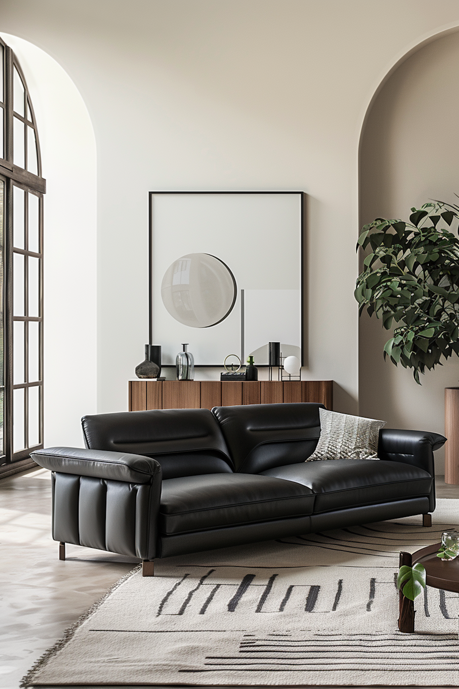 Modern living room with black leather sofa, abstract art, and natural light from arched windows.