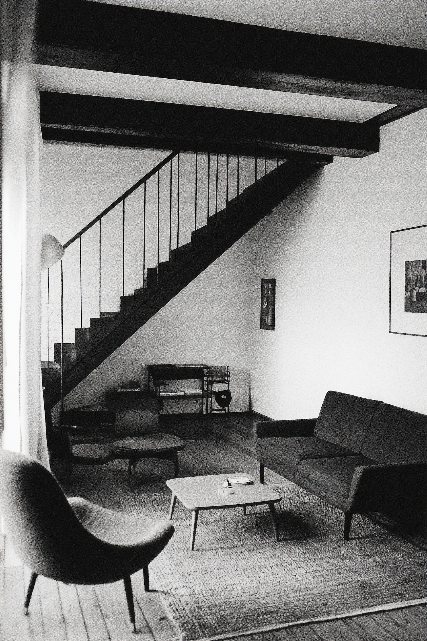 Monochrome modern living room with sleek staircase, mid-century furniture, and minimalist decor. Calm and sophisticated ambiance.