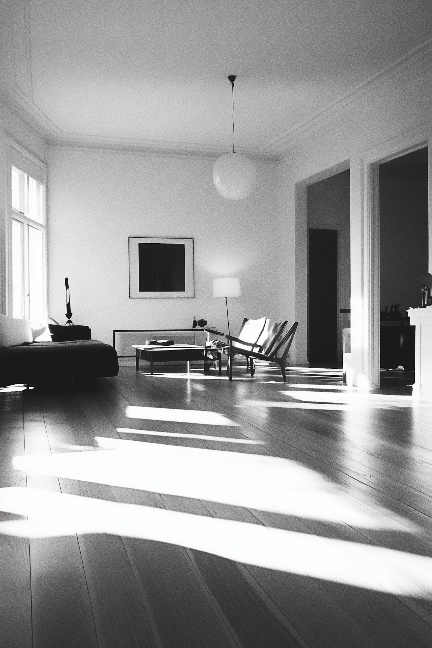 Minimalist living room with modern furniture, natural light, and abstract art. Sunlight creates patterns on the wooden floor.