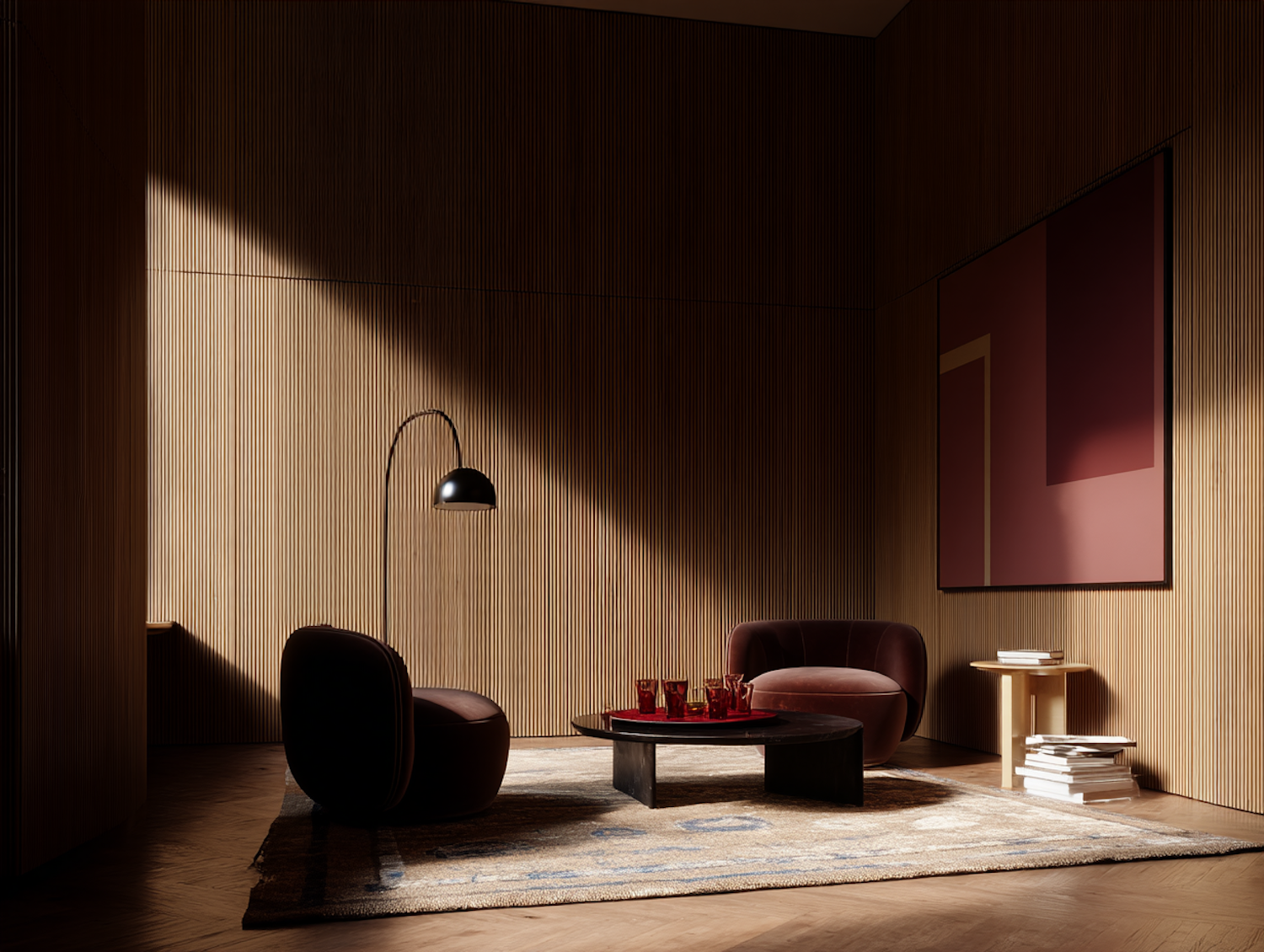 Minimalist living room with burgundy armchairs, wooden panel walls, abstract art, and a cozy rug. Perfect blend of modern and warm design.