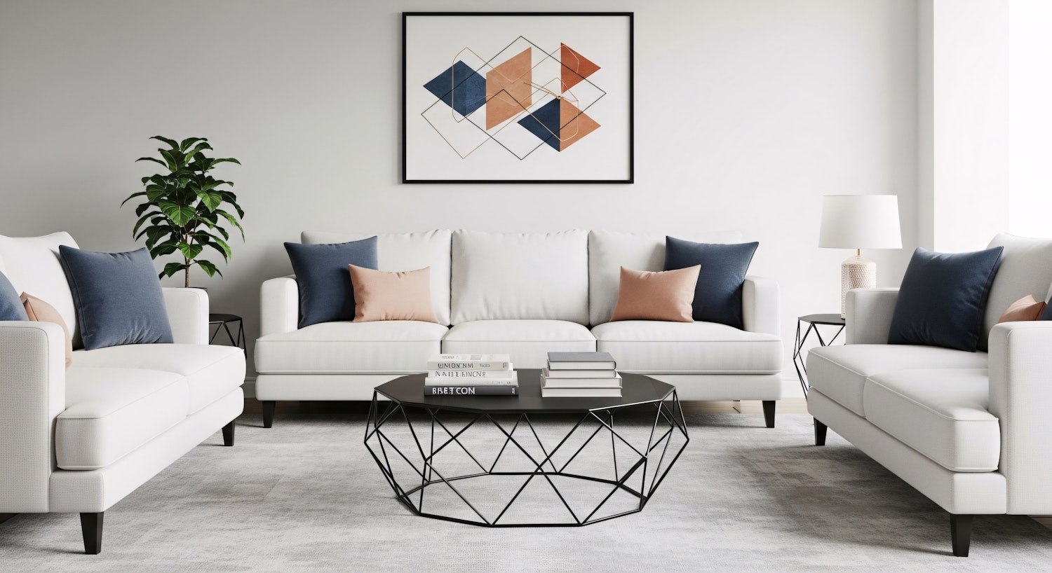 Modern living room with white sofas, blue and peach pillows, geometric coffee table, abstract wall art, and a potted plant.
