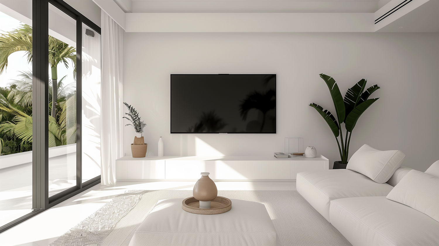 Modern living room with minimalist decor, white sofa, large TV, and lush outdoor view through glass doors.