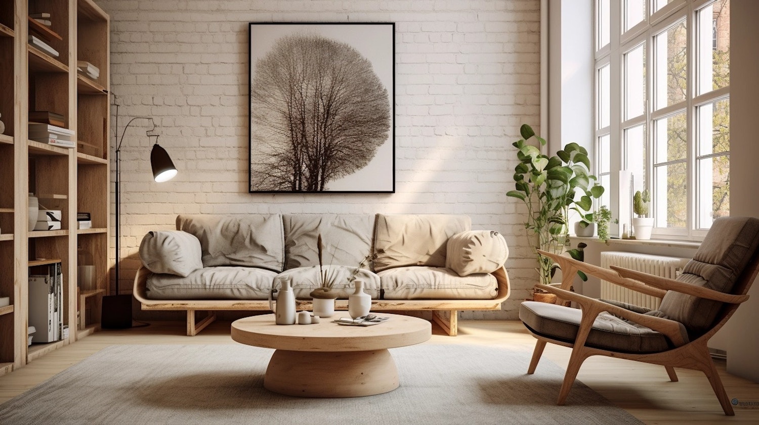 Cozy living room with beige sofa, wooden furniture, and large windows. Minimalist decor with natural light and a tree photograph.