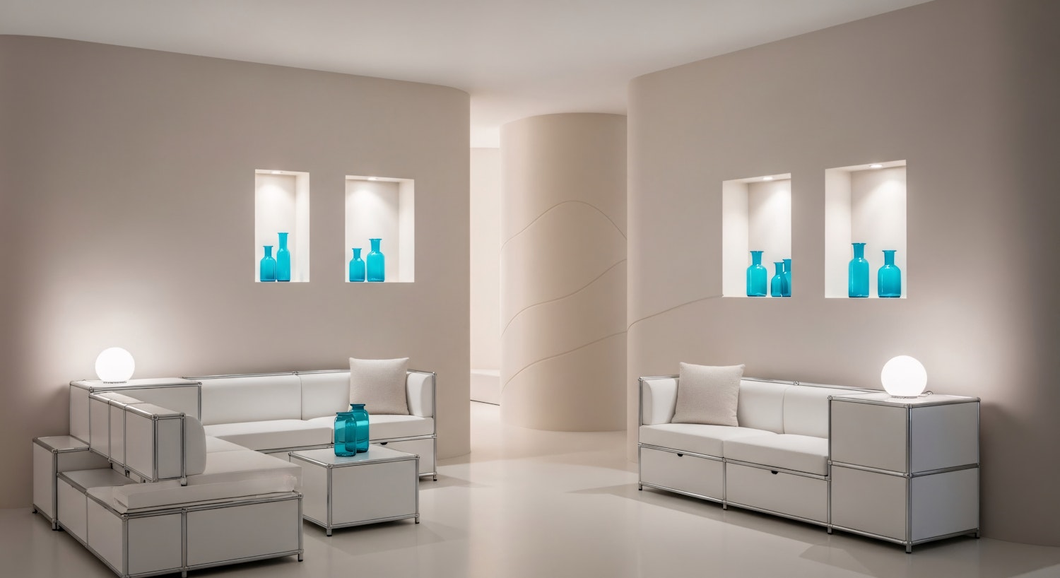 Minimalist living room with white modular sofas, blue glass vases, and soft lighting for a modern and serene ambiance.