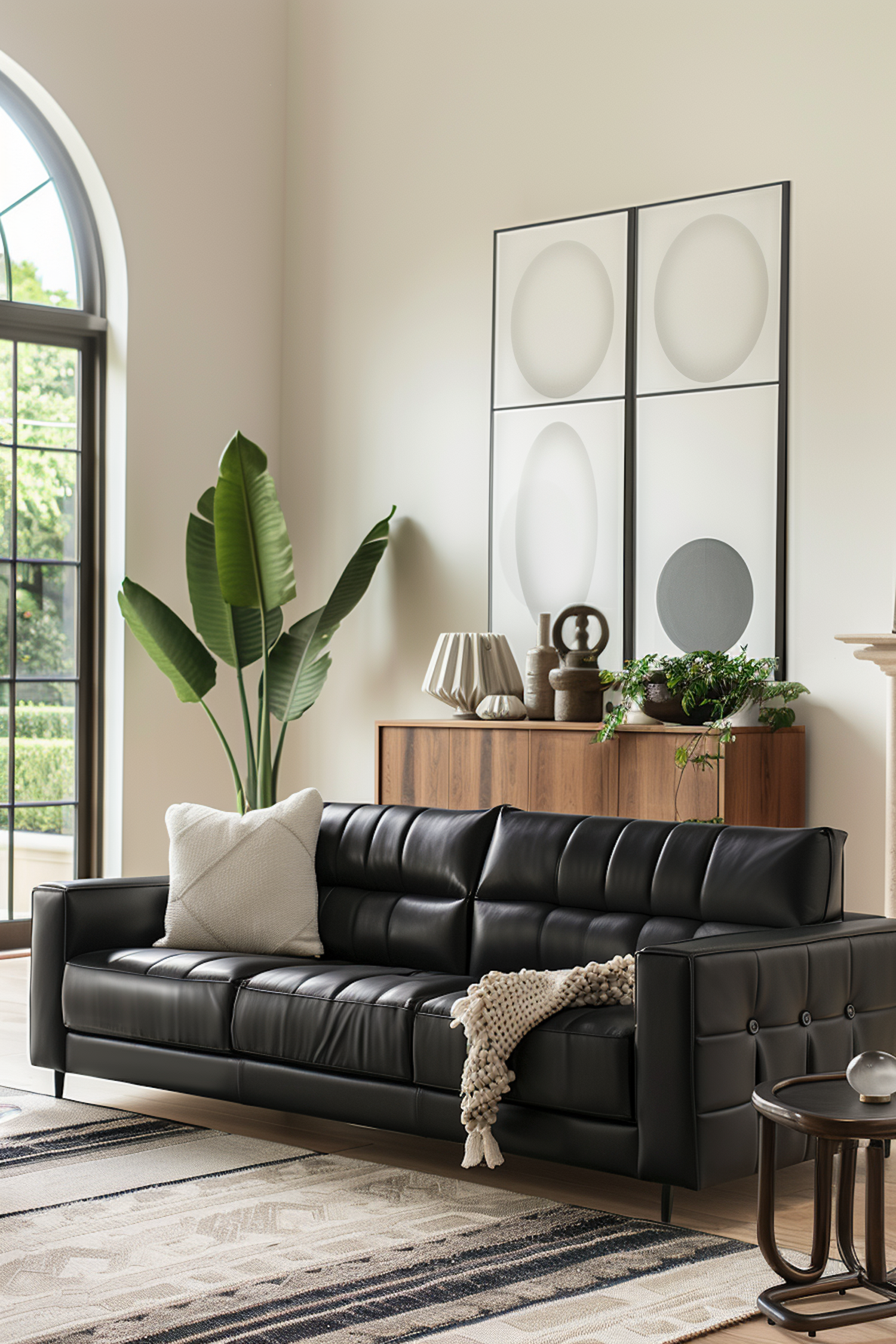 Modern living room with black leather sofa, abstract art, and natural light. Features a cozy throw, decorative vases, and a tall green plant.