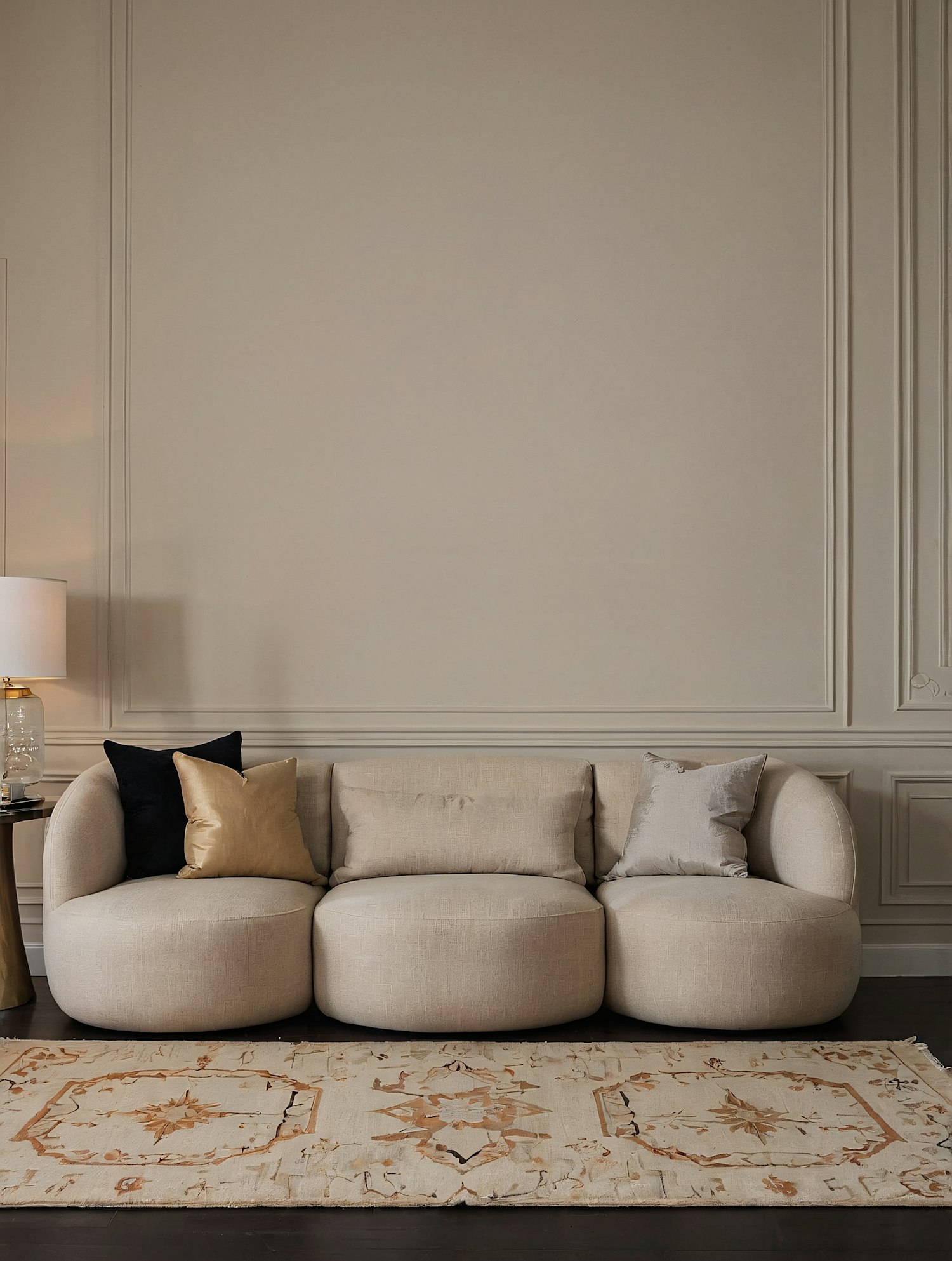 Minimalist living room with a beige rounded sofa, patterned rug, and elegant decor. Perfect blend of modern and classic design elements.