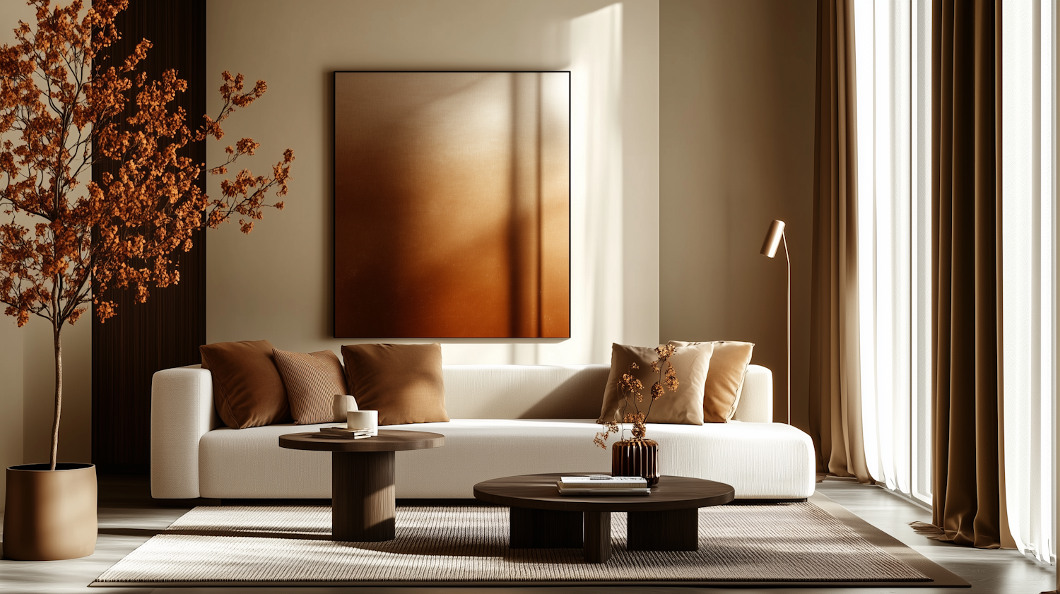 Modern living room with earthy tones, featuring a white sofa, brown cushions, abstract art, and a potted tree with orange leaves.