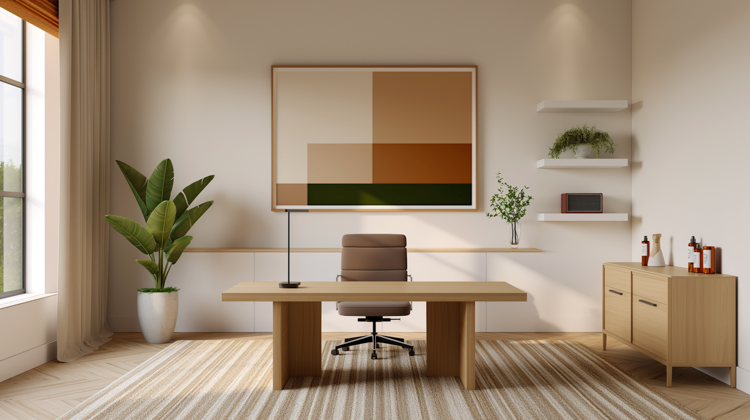 Modern office with wooden desk, abstract art, and greenery. Minimalist design with natural light and earthy tones.
