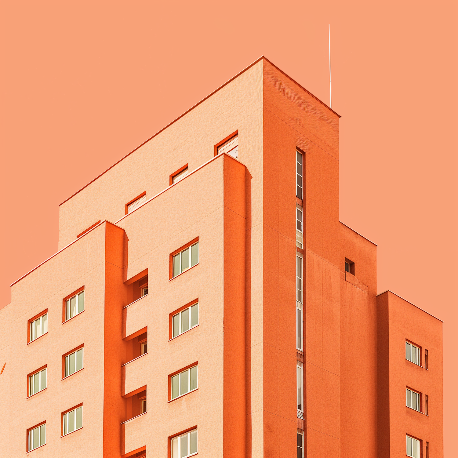 Modern orange building with geometric design against a matching orange sky, featuring clean lines and rectangular windows.