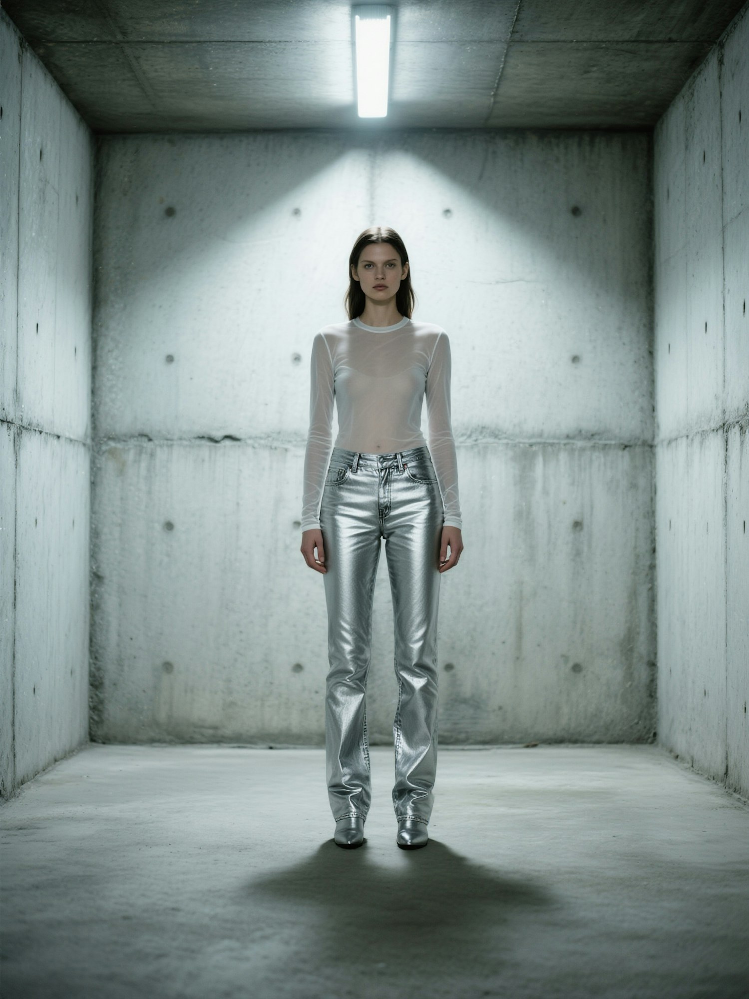 A woman in a minimalist concrete room, wearing a sheer white top and metallic silver pants, under a single overhead light.
