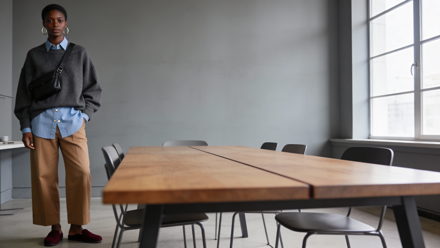 A stylish individual in a modern room with a wooden table and chairs, wearing a layered outfit with a crossbody bag.