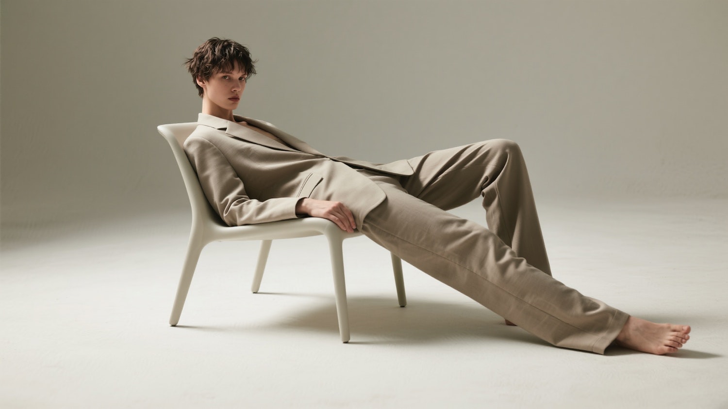 Stylish individual in a beige suit lounging in a minimalist chair against a neutral background, showcasing modern fashion and design.