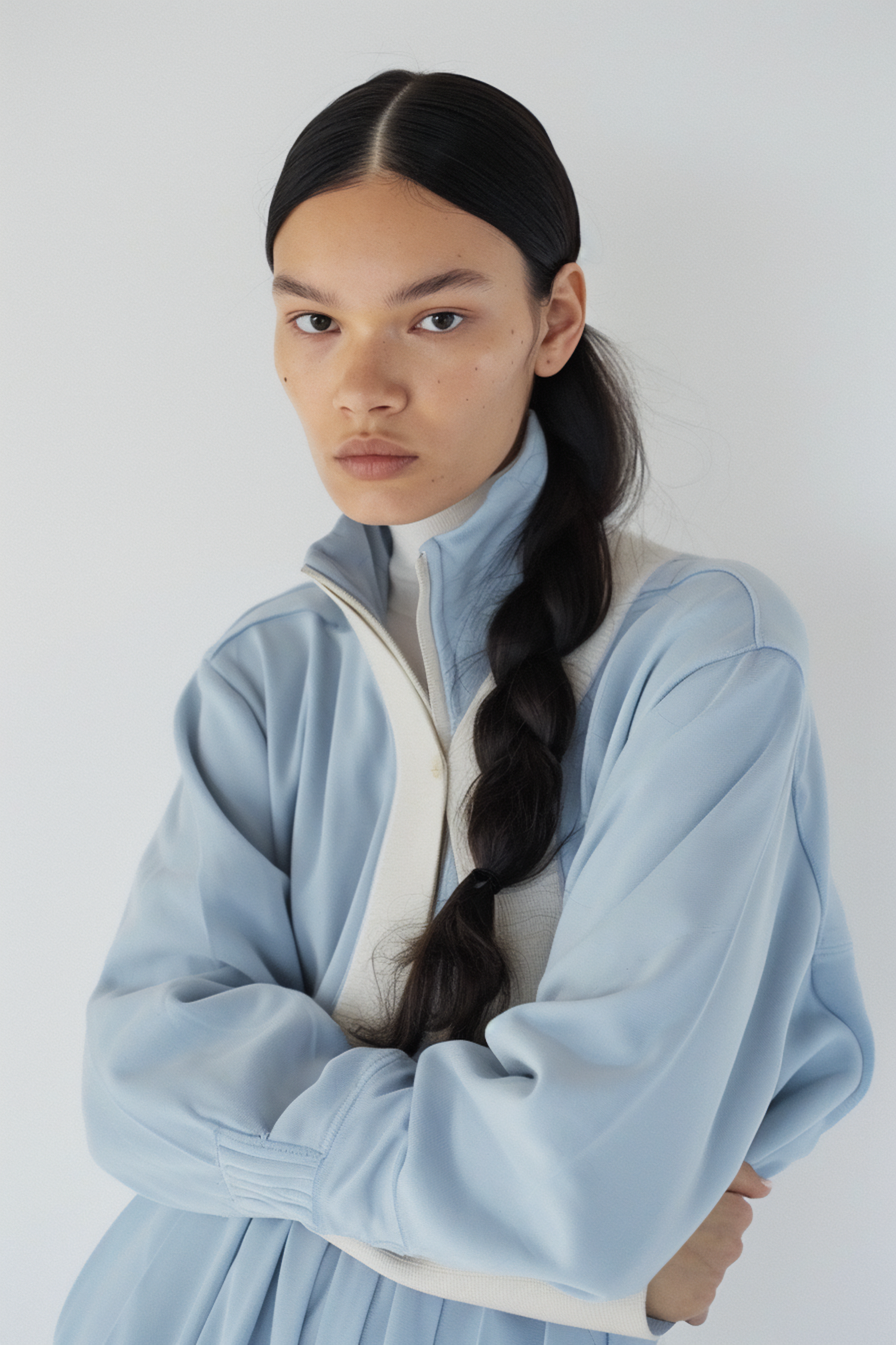 Minimalist portrait of a young woman in a sleek braid, light blue jacket, and white turtleneck, exuding a modern and composed vibe.