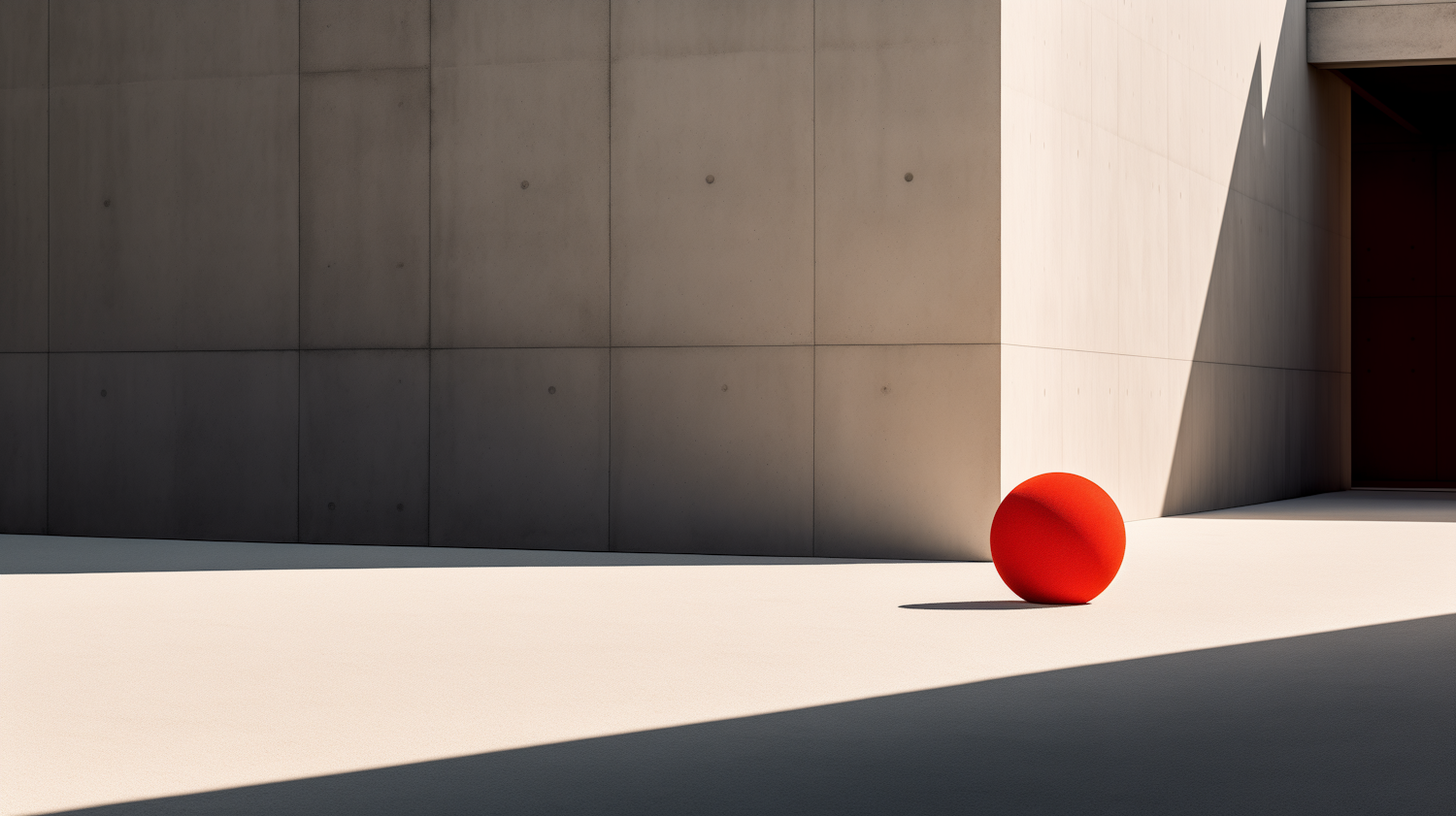 Minimalist scene with a vivid red sphere against a concrete wall, casting sharp shadows in bright sunlight.