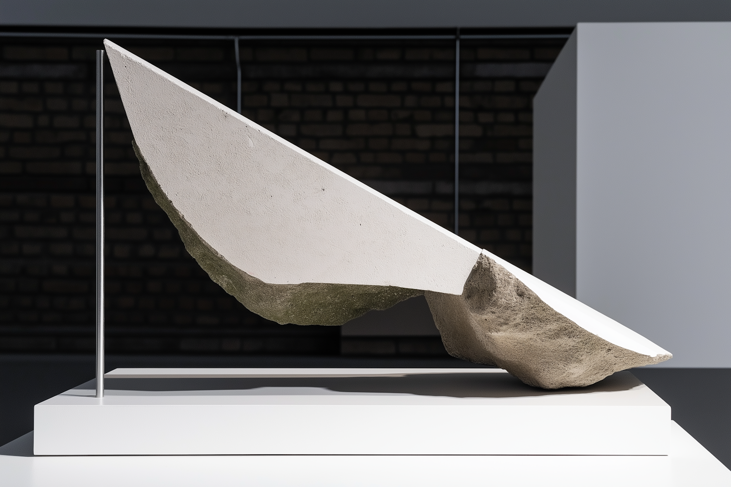 Minimalist sculpture with a sleek white plane and rough stone base on display in a modern gallery setting.