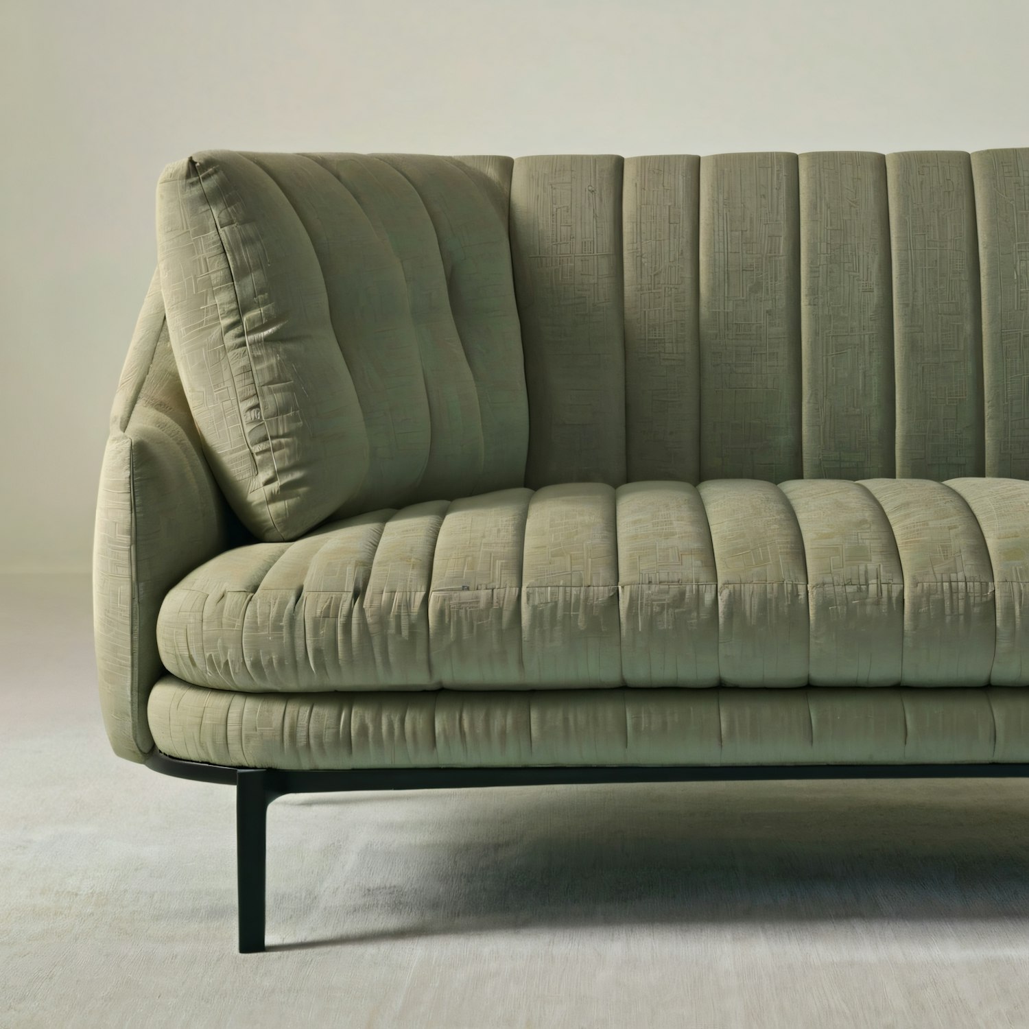 Modern green sofa with geometric pattern and black metal legs, set against a light background. Plush cushions offer a cozy look.