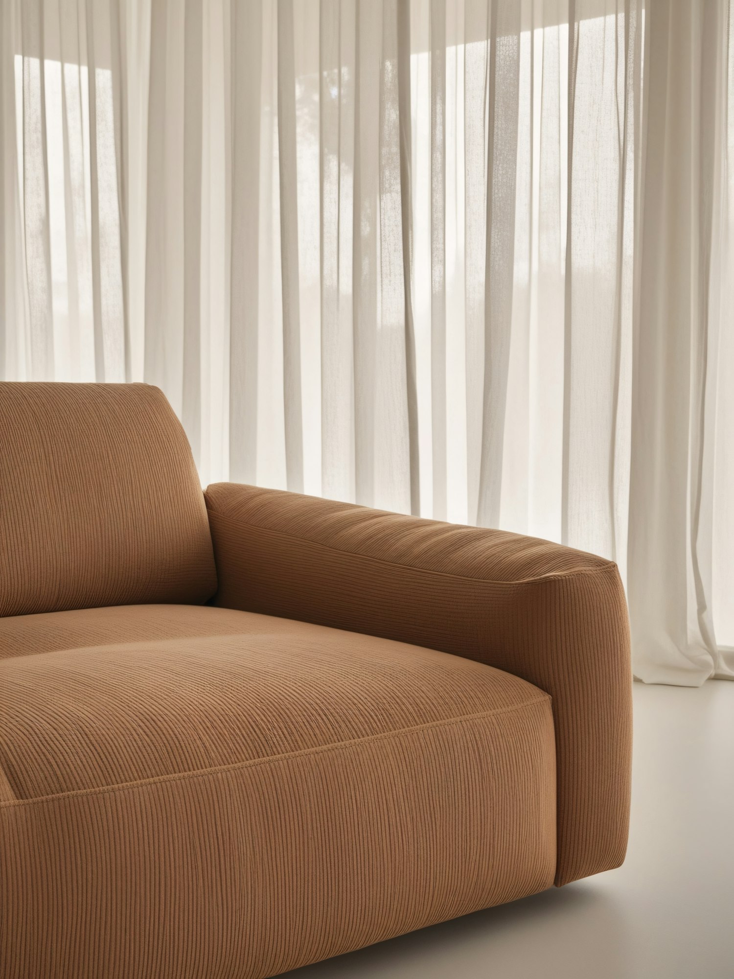 Minimalist living room with a plush brown sofa and sheer white curtains, creating a serene and elegant atmosphere.