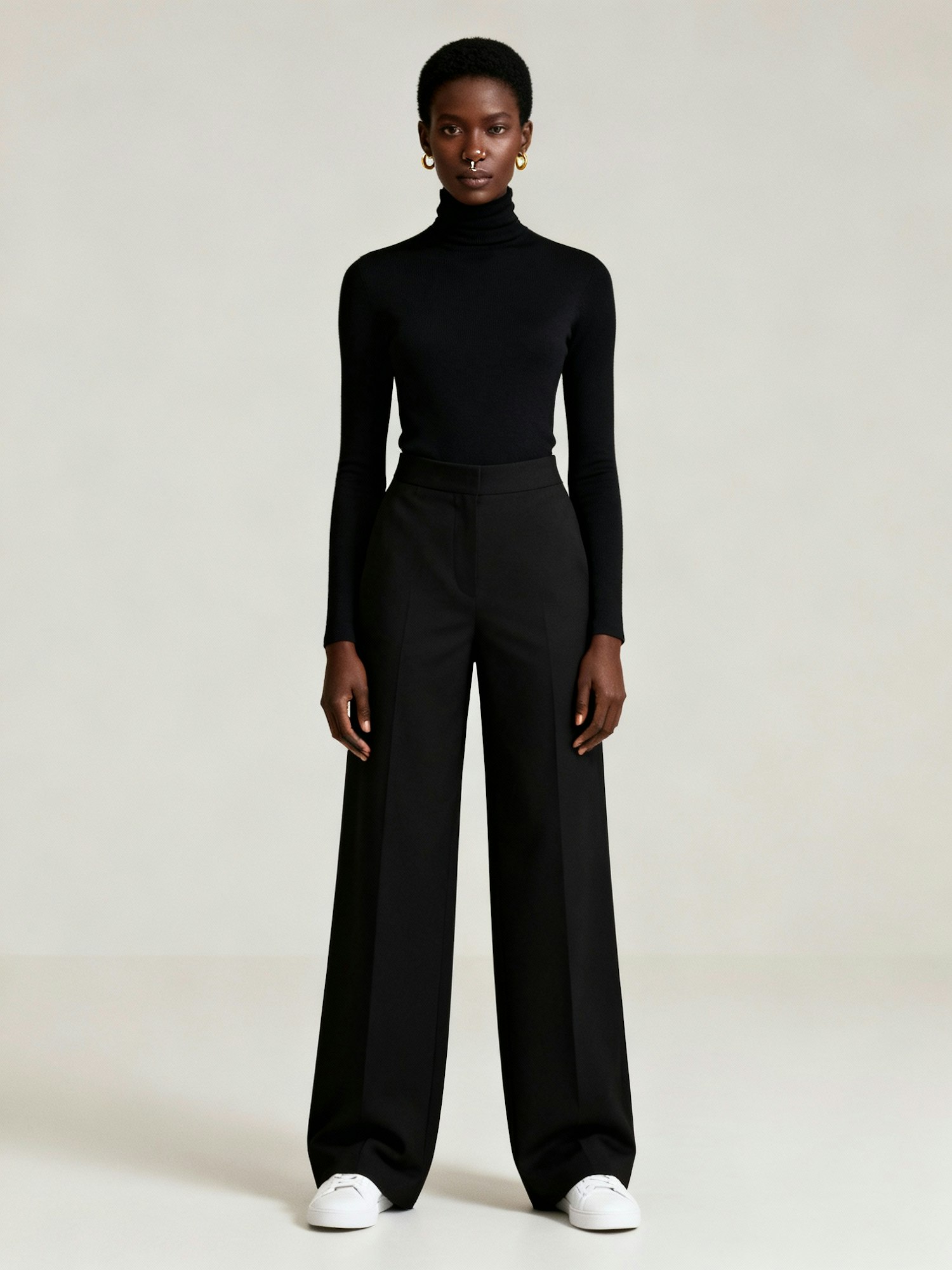 Waist-up, high-definition portrait of a stylish Black woman standing against a clean, minimalist backdrop. She wears a modern black turtleneck paired with wide-leg trousers, creating a sleek silhouette. Crisp white sneakers peek out below, adding contrast and a touch of Gen Z edge. Her short black hair is styled simply, and she gazes confidently at the camera. Her melanin glows under soft, even lighting. Accessories include small gold hoop earrings and a tiny nose ring, adding subtle shine and personality. The neutral background enhances the depth of her outfit, making the textures and tones stand out. The overall mood is minimalist, modern, and editorially sharp—ideal for a fashion portrait or Afro-fusion identity showcase.