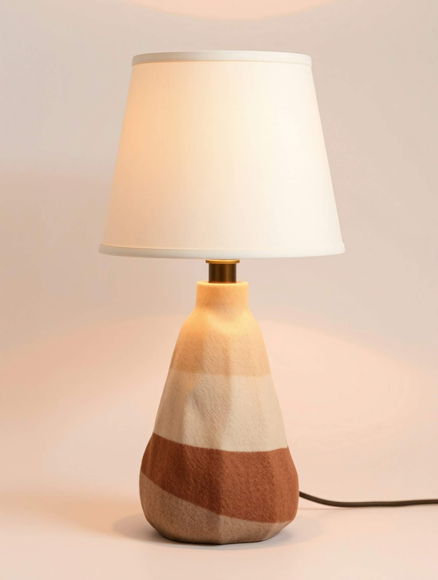Modern table lamp with a conical white shade and a textured, striped base in beige, cream, and brown tones. Elegant and stylish design.