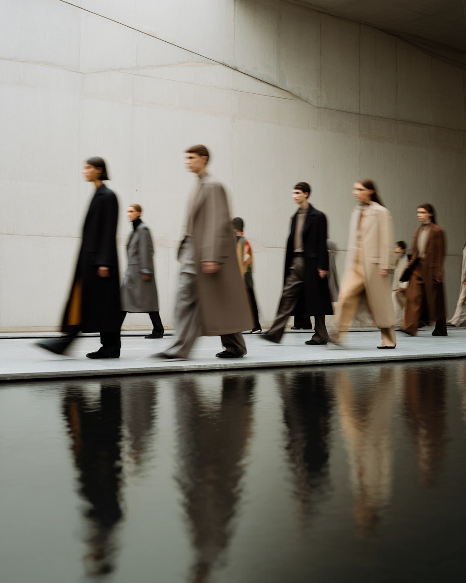 A group of people in neutral-toned coats walk along a modern setting, their reflections mirrored in a calm water surface.