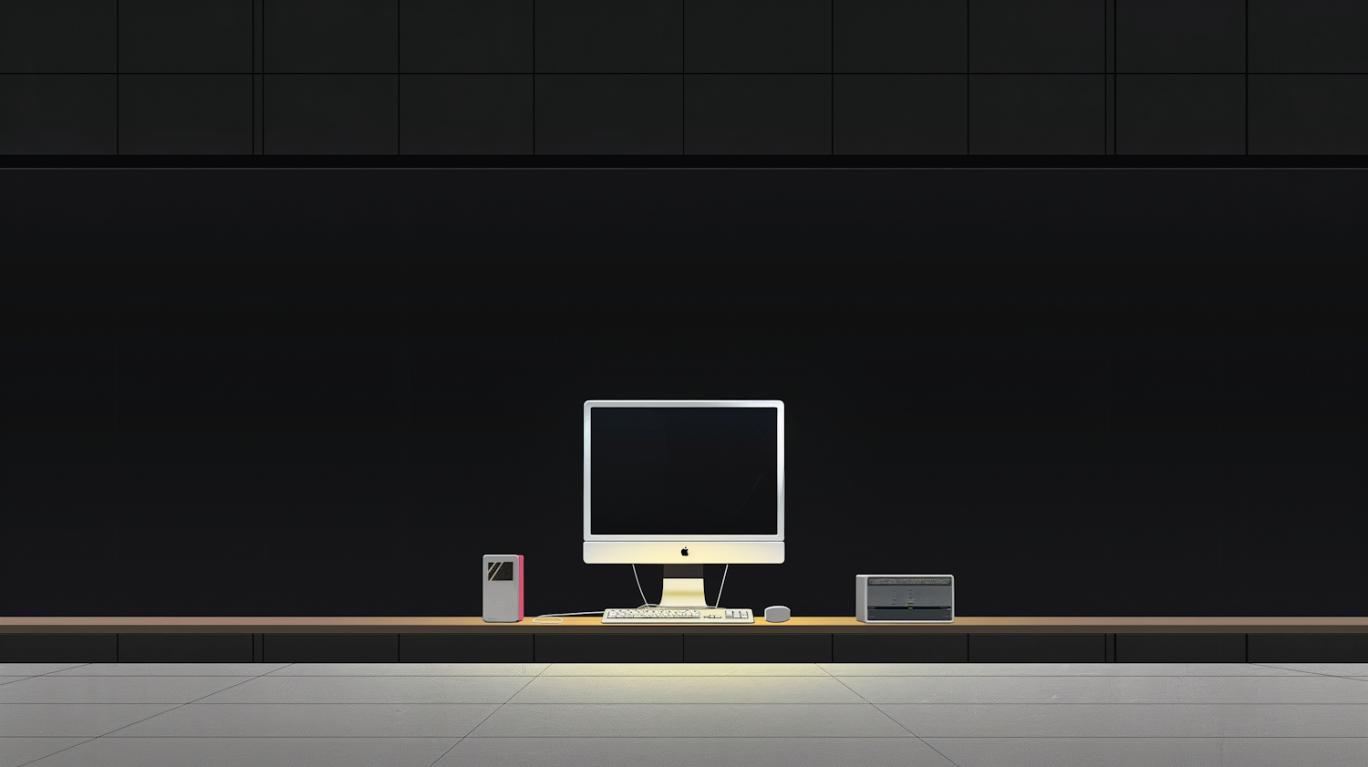 Minimalist workspace with a sleek computer setup on a wooden desk against a black background, emphasizing simplicity and elegance.