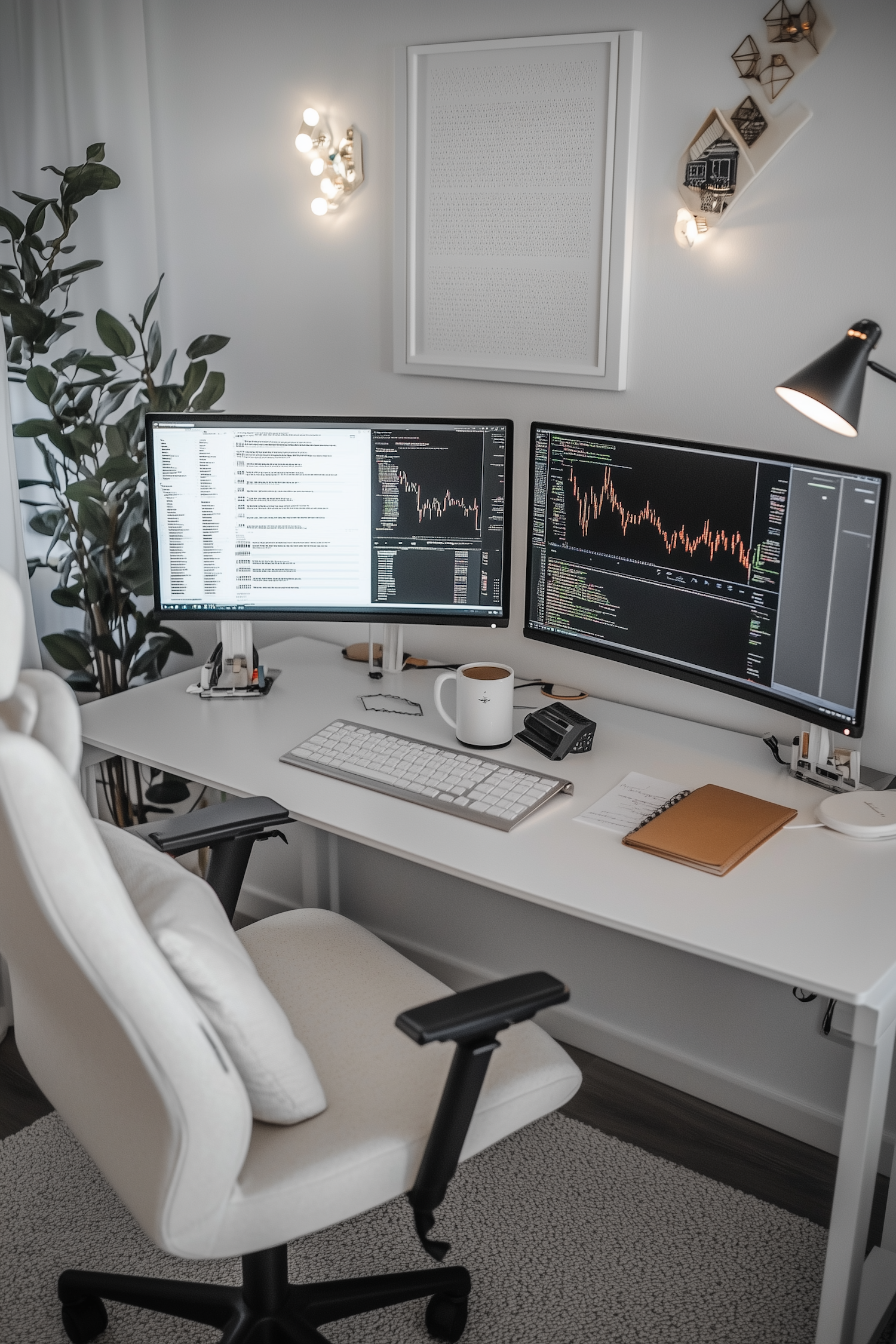 Modern home office with dual monitors displaying financial data, a white desk, ergonomic chair, and stylish lighting for a sleek workspace.