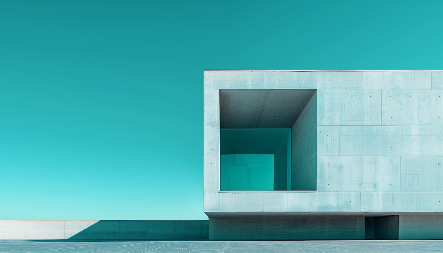 Minimalist concrete architecture against a turquoise sky, featuring geometric shapes and deep shadows for a modern aesthetic.