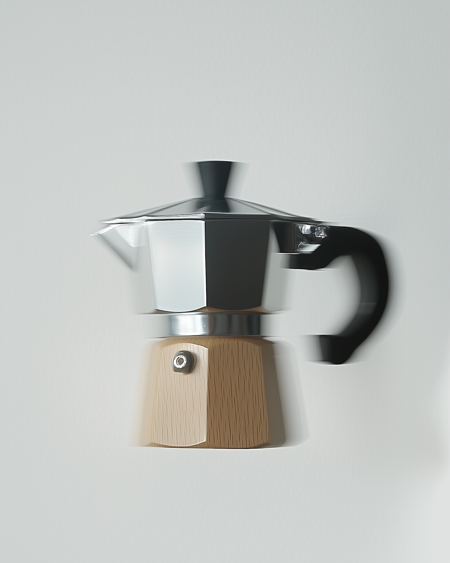 Stylish moka pot with a metallic top and wooden-textured base, featuring a black handle and a modern, minimalist design.