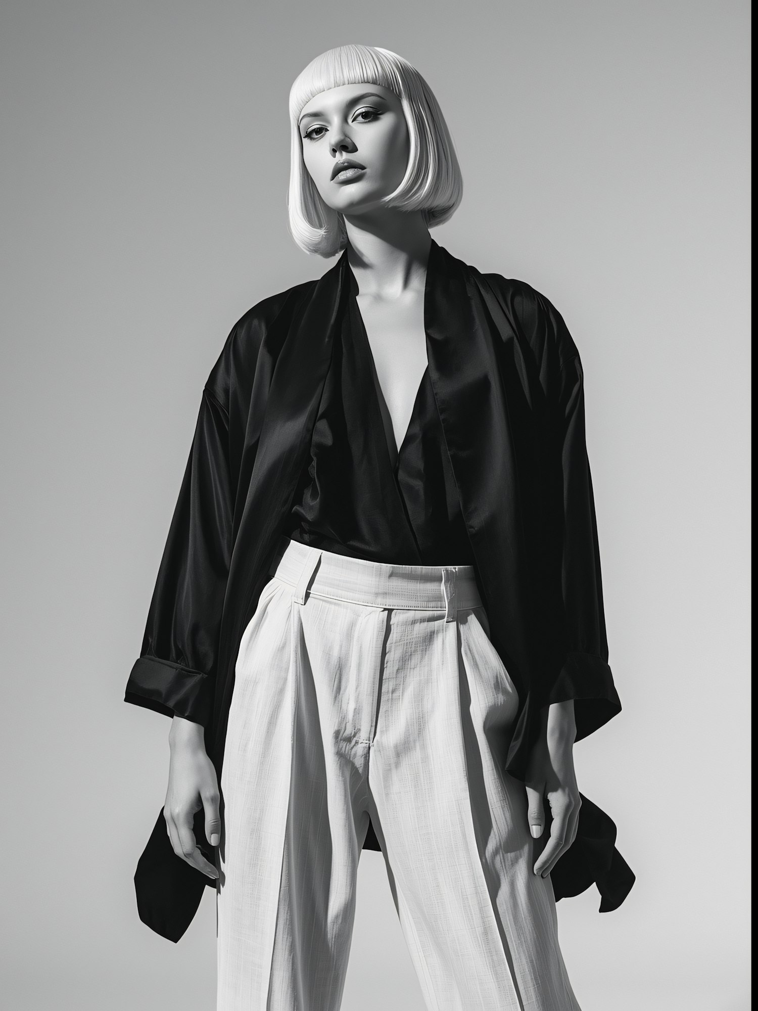 Monochrome portrait of a stylish woman in a black satin top and white trousers, showcasing modern fashion and sleek elegance.